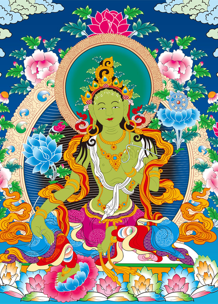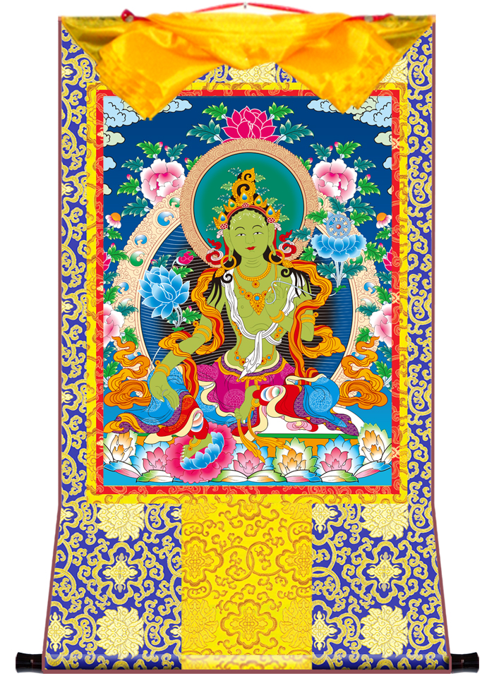 因是佛教圣相,所以我們選用的裝裱材料均是現在能有的最好的裝裱材料,正面選用定制的高檔棉織金絲錦緞很多仿制的是化纖材料,織繡藏傳佛教的富貴蓮花圖案,背面使用加厚仿真絲黃色綢緞布,手工精細裝裱而成,帶掛軸,照面,可直接懸掛到墻上。 <