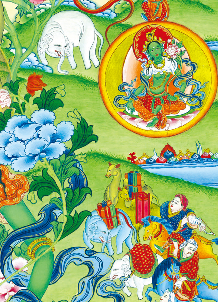 因是佛教圣相,所以我們選用的裝裱材料均是現在能有的最好的裝裱材料,正面選用定制的高檔棉織金絲錦緞很多仿制的是化纖材料,織繡藏傳佛教的富貴蓮花圖案,背面使用加厚仿真絲黃色綢緞布,手工精細裝裱而成,帶掛軸,照面,可直接懸掛到墻上。