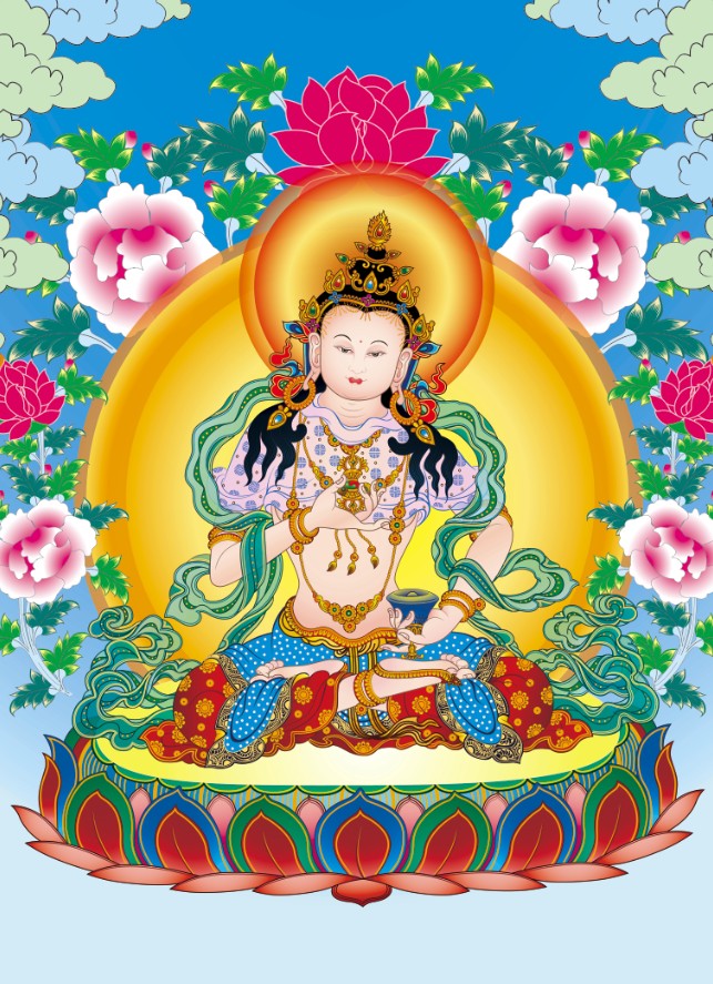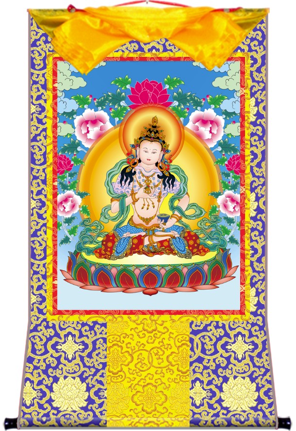 因是佛教圣相,所以我們選用的裝裱材料均是現在能有的最好的裝裱材料,正面選用定制的高檔棉織金絲錦緞很多仿制的是化纖材料,織繡藏傳佛教的富貴蓮花圖案,背面使用加厚仿真絲黃色綢緞布,手工精細裝裱而成,帶掛軸,照面,可直接懸掛到墻上。