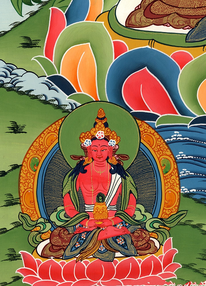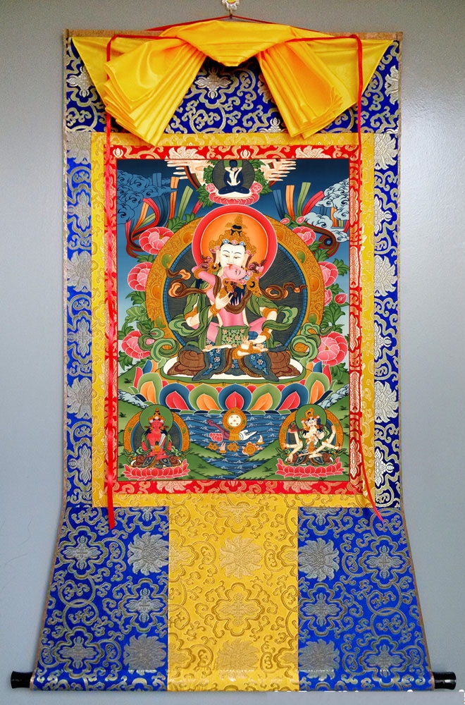 因是佛教圣相,所以我們選用的裝裱材料均是現在能有的最好的裝裱材料,正面選用定制的高檔棉織金絲錦緞很多仿制的是化纖材料,織繡藏傳佛教的富貴蓮花圖案,背面使用加厚仿真絲黃色綢緞布,手工精細裝裱而成,帶掛軸,照面,可直接懸掛到墻上。