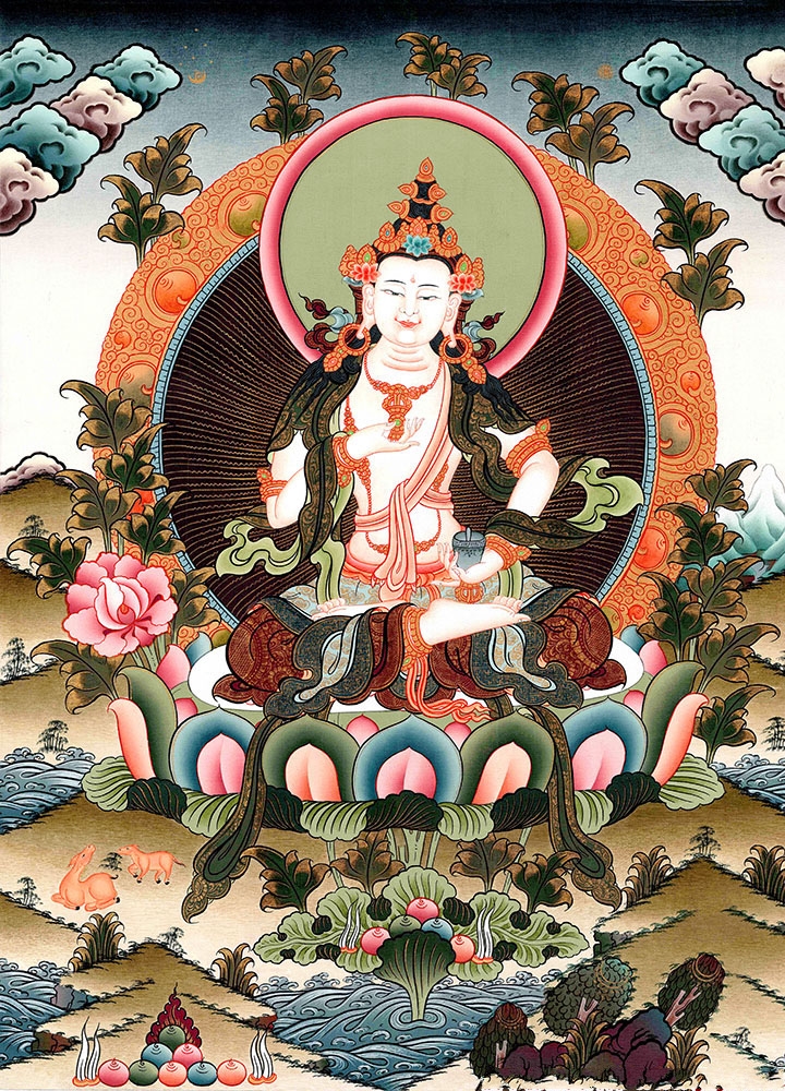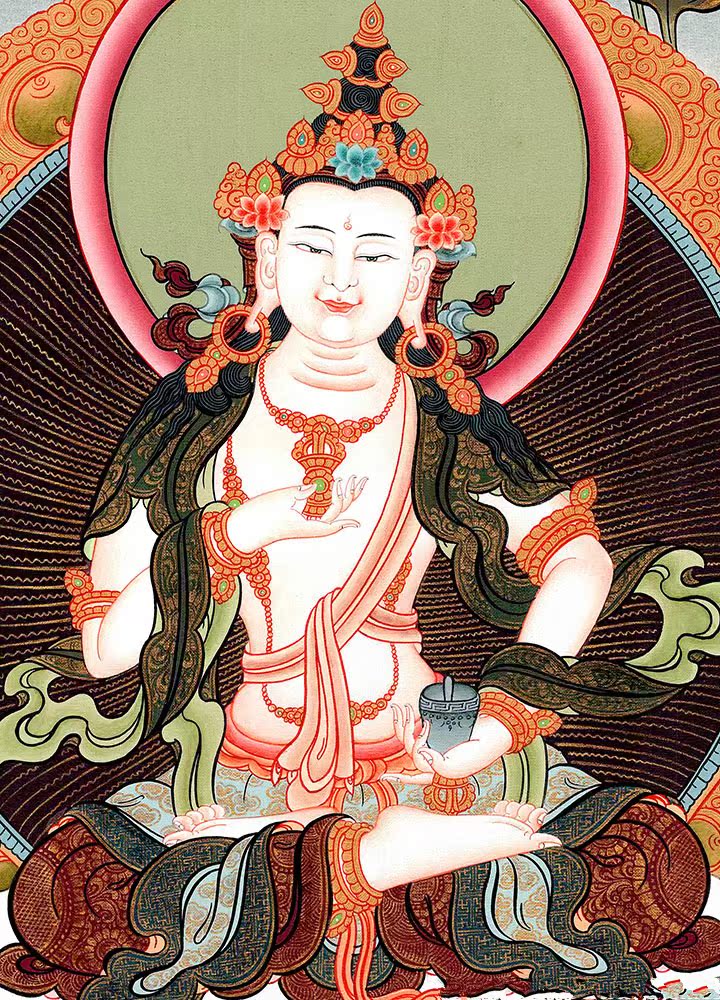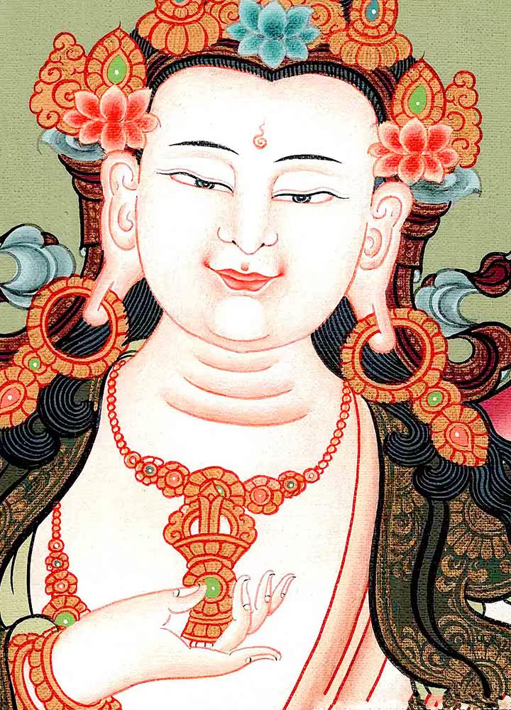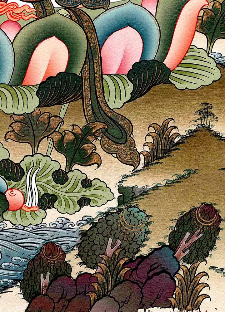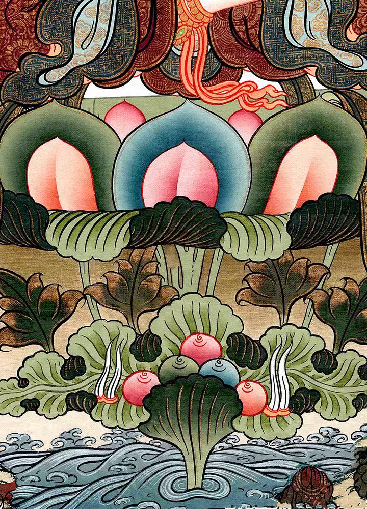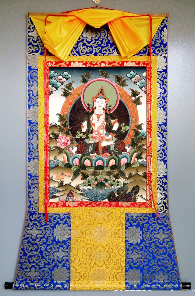 因是佛教圣相,所以我們選用的裝裱材料均是現在能有的最好的裝裱材料,正面選用定制的高檔棉織金絲錦緞很多仿制的是化纖材料,織繡藏傳佛教的富貴蓮花圖案,背面使用加厚仿真絲黃色綢緞布,手工精細裝裱而成,帶掛軸,照面,可直接懸掛到墻上。