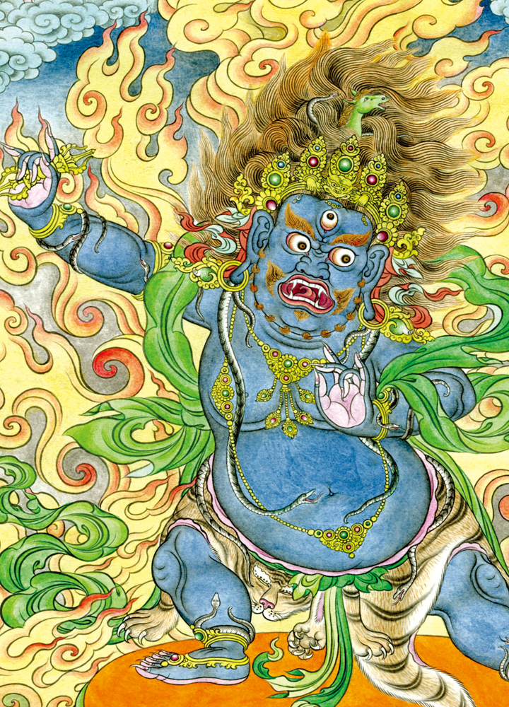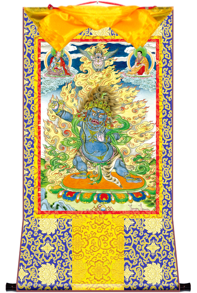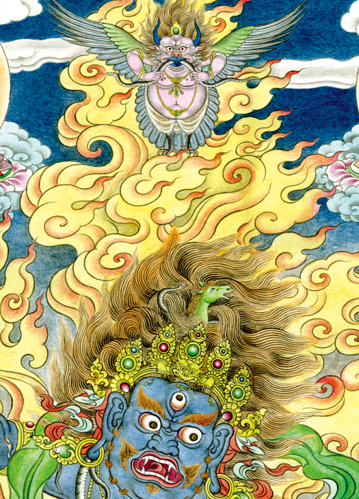在藏密本尊中,不乏一些相互間組合的本尊,如金剛手和五大鵬金翅鳥,金剛手、馬頭明王、大鵬金翅鳥等。金剛手三尊合一本尊就是指金剛手、馬頭明王和大鵬金翅鳥的組合。 此本尊屬于事密部,傳承有“遠傳”及“近傳”兩種。所謂“遠傳”,是指從釋迦牟尼佛開始,傳承至今的,中間經歷各位大師而沒有中斷的傳承。所謂“近”傳,是指佛教某位大師,通過修持遠傳傳承得到一定成就后,親見本尊,而直接從此本尊處得到修持竅訣,再流傳下來的傳承。 雖然現在的時代科學飛速發展,人們得到了前所未有的物質與精神生活,但各種稀奇古怪而又難以醫治的疾病也接踵而至,使得目前的科學力量也束手無策。加上愈來越多的天災人禍,令人無法專心致志修持佛法。有鑒于此,佛陀將身化現為大鵬金翅鳥,將語化現為馬頭明王,將意化現為金剛手,而成為金剛手三尊合一忿怒本尊,希望他的弟子能通過修持此本尊,而獲得諸佛身口意的加持,從而排除來自各方的干擾,順利抵達生死彼岸。 如果將各種障礙歸納起來,無非來自三處,即天上、人間及地下。地下主要指龍族一類,而大鵬金翅鳥正是他們的克星。馬頭明王可以對治來自人間的各種障礙,金剛手可以對治來自天上的障礙。天上的障礙主要是指日月星煞帶來的障礙,現代科學也證明天體的運行,對地球以及人體都有很大影響,比如潮汐、月經等。所以修持金剛手三尊合一即可以對治一切障礙,因而此本尊非常受藏傳佛教徒的青睞,即使藏族僧人也是如此。 僧人在傳統上都要學習五部經論,次第學修。但是由于受智力、環境等各種條件影響,并不是每個僧人都可以完成五部經學的課程,那些智力相對低下,無法深入學習經論者,頗有一些在求得此本尊灌頂修法后,閉關專修。那些善根深厚、專心修持者,大都可以在為期三個月或者一年多的時間中,完成本尊咒的數量,并且獲得一些神秘能力。比如以舌頭舔燒紅的鐵器,為他人治病等。 金剛手三尊合一本尊為一面雙臂,身體為深藍色。右手高舉,持金剛杵,左手當胸結期克印。身飾各種珍寶,頭戴五佛寶冠,白花色剎帝利種的龍裝飾在發髻上,黃花色吠舍種的龍裝飾在雙耳上,紅花色婆羅門種的龍裝飾為腰帶,綠花色須陀羅種的龍裝飾為手鐲和腳釧,黑花色旃陀羅種的龍裝飾在胸前。下穿虎皮裙,上披天衣。以右蜷左展之威武立姿,安立于智慧火焰之中。頭發為黃色,直立上揚,猶如燃燒的火焰。在金剛手的頭頂,有三個面向不同方向的綠色馬頭,代表馬頭明王。馬頭明王“咦哈哈哈…”鳴嘯之聲,震動三界,一切邪魔驚惶失措,暈厥昏倒。面向自己方向的馬頭象征加持修持者,面向左面之馬頭象征統領一切父續空行,面向右邊之馬頭象征統領一切母續空行。在馬頭的上方,有一大鵬金翅鳥。身為白色,三只眼。上身如人,下身似鳥。嘴如金剛一般堅硬,可以啄穿一切物體。雙翅上揚,每根羽毛都如寶劍般鋒利,能輕易斬斷任何碰觸的物體,如吹毛斷發般,雙翅舞動,足以撼動整個宇宙。金翅鳥頭頂裝飾著一個如意寶。那如金剛般堅硬的雙爪,抓著白色、藍色、紅色和綠色四條龍,右爪抓龍頭,左爪抓龍尾。中間用金剛喙銜著。鳥王身上有五條龍以為裝飾,極其恐怖、威猛地舞動。 唐卡本身是用來觀修之用,但由于畫法等限制,無法完全表達儀軌中的要求。因此,在做此本尊觀想時,把本尊觀想得越巨大越好,威力越大越好,只有在修持者的意念中消退自我觀念,建立起真正本尊的概念,才能降服一切妖魔。如果在觀想的時候,僅僅作為圖片來觀想,則不會有太大的作用。
