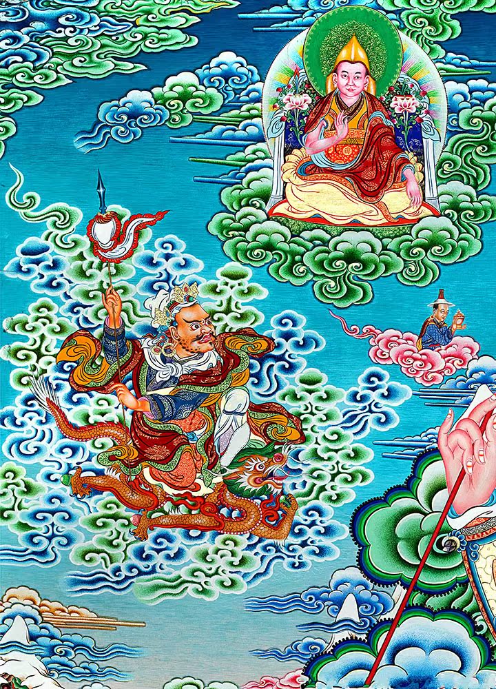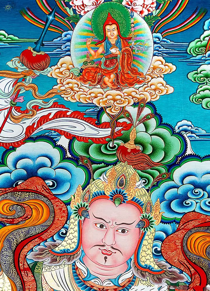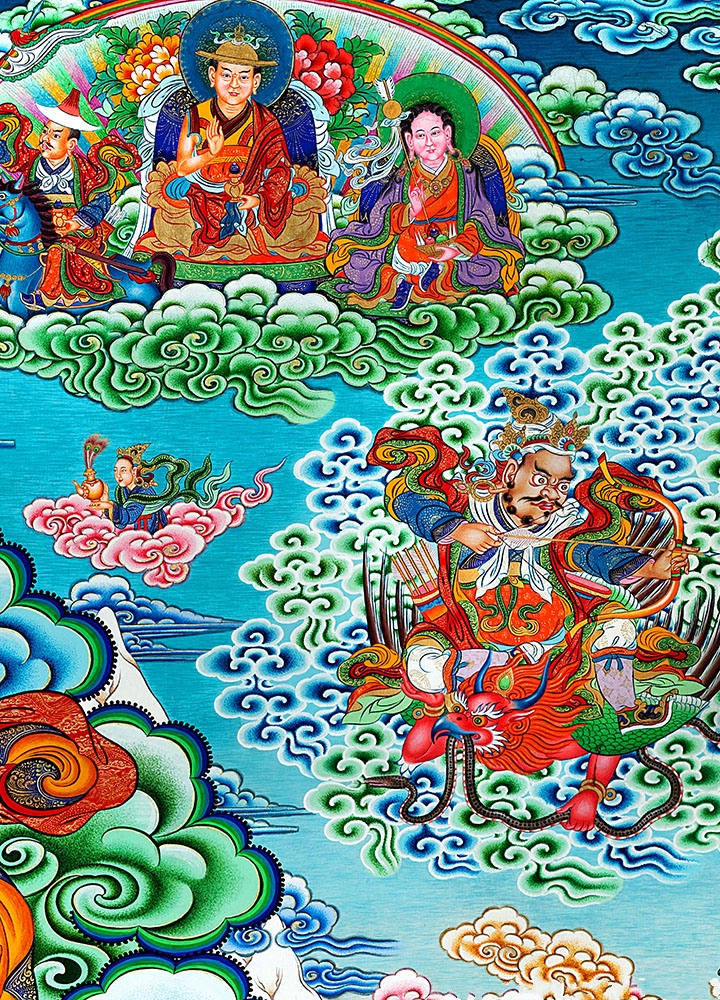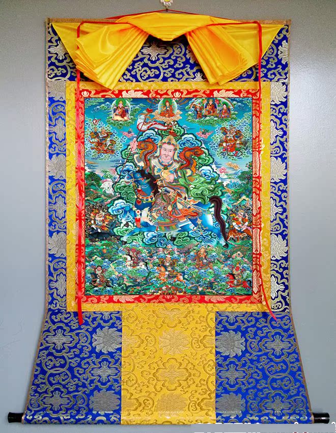 因是佛教圣相,所以我們選用的裝裱材料均是現在能有的最好的裝裱材料,正面選用定制的高檔棉織金絲錦緞很多仿制的是化纖材料,織繡藏傳佛教的富貴蓮花圖案,背面使用加厚仿真絲黃色綢緞布,手工精細裝裱而成,帶掛軸,照面,可直接懸掛到墻上。