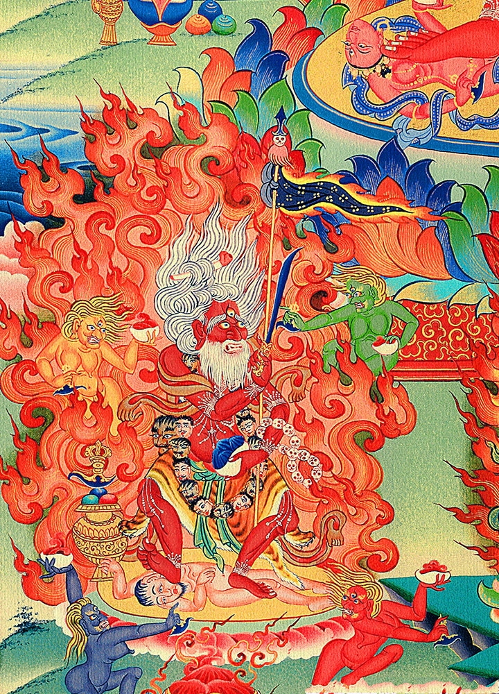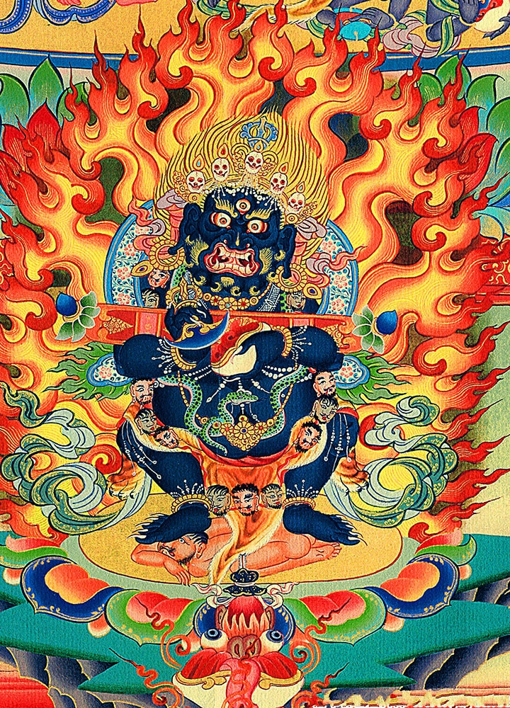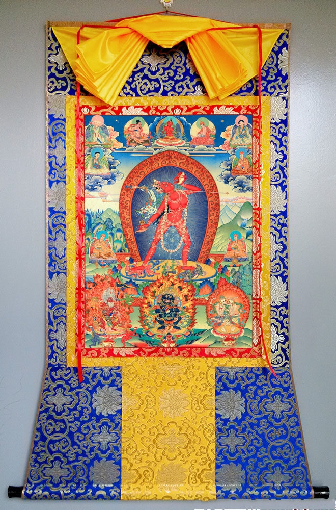 因是佛教圣相,所以我們選用的裝裱材料均是現在能有的最好的裝裱材料,正面選用定制的高檔棉織金絲錦緞很多仿制的是化纖材料,織繡藏傳佛教的富貴蓮花圖案,背面使用加厚仿真絲黃色綢緞布,手工精細裝裱而成,帶掛軸,照面,可直接懸掛到墻上。