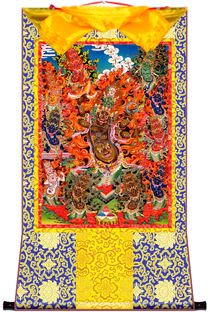 因是佛教圣相,所以我們選用的裝裱材料均是現在能有的最好的裝裱材料,正面選用定制的高檔棉織金絲錦緞很多仿制的是化纖材料,織繡藏傳佛教的富貴蓮花圖案,背面使用加厚仿真絲黃色綢緞布,手工精細裝裱而成,帶掛軸,照面,可直接懸掛到墻上。