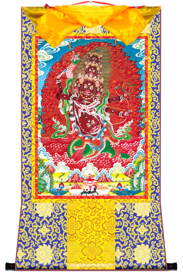 因是佛教圣相,所以我們選用的裝裱材料均是現在能有的最好的裝裱材料,正面選用定制的高檔棉織金絲錦緞很多仿制的是化纖材料,織繡藏傳佛教的富貴蓮花圖案,背面使用加厚仿真絲黃色綢緞布,手工精細裝裱而成,帶掛軸,照面,可直接懸掛到墻上。