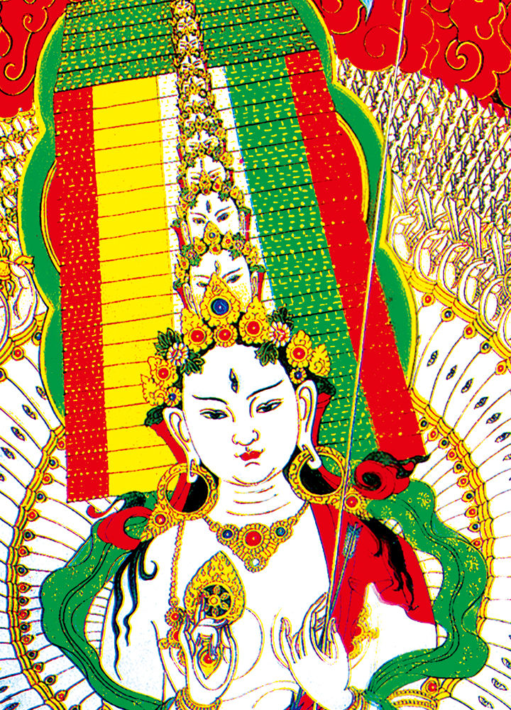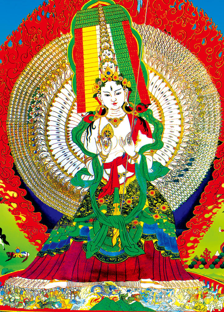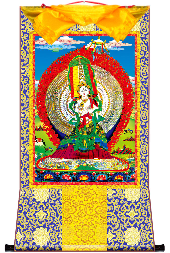 因是佛教圣相,所以我們選用的裝裱材料均是現在能有的最好的裝裱材料,正面選用定制的高檔棉織金絲錦緞很多仿制的是化纖材料,織繡藏傳佛教的富貴蓮花圖案,背面使用加厚仿真絲黃色綢緞布,手工精細裝裱而成,帶掛軸,照面,可直接懸掛到墻上。