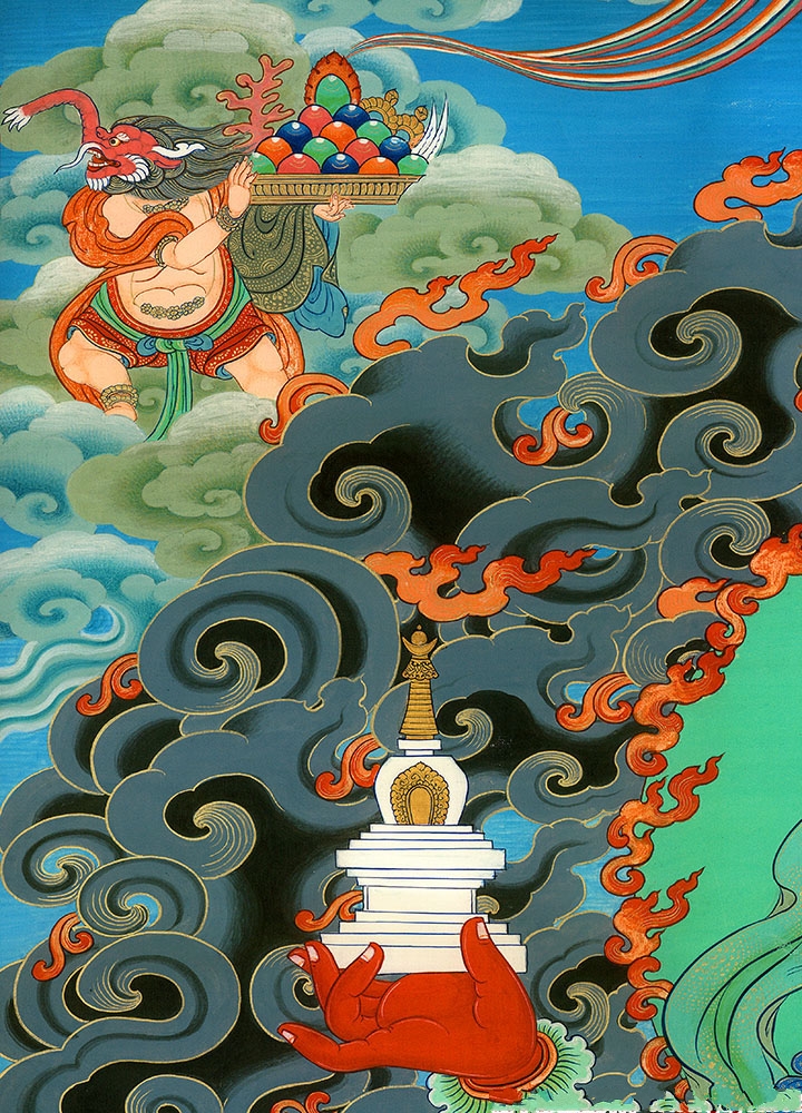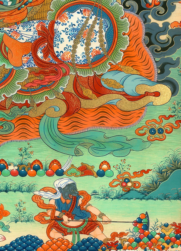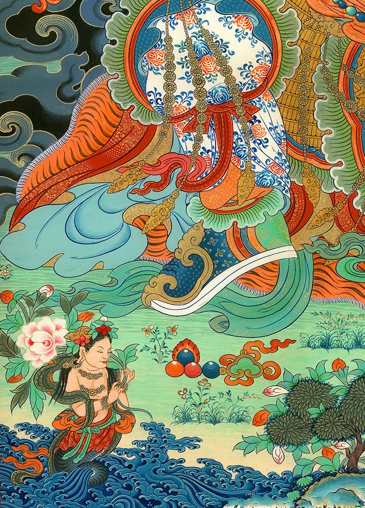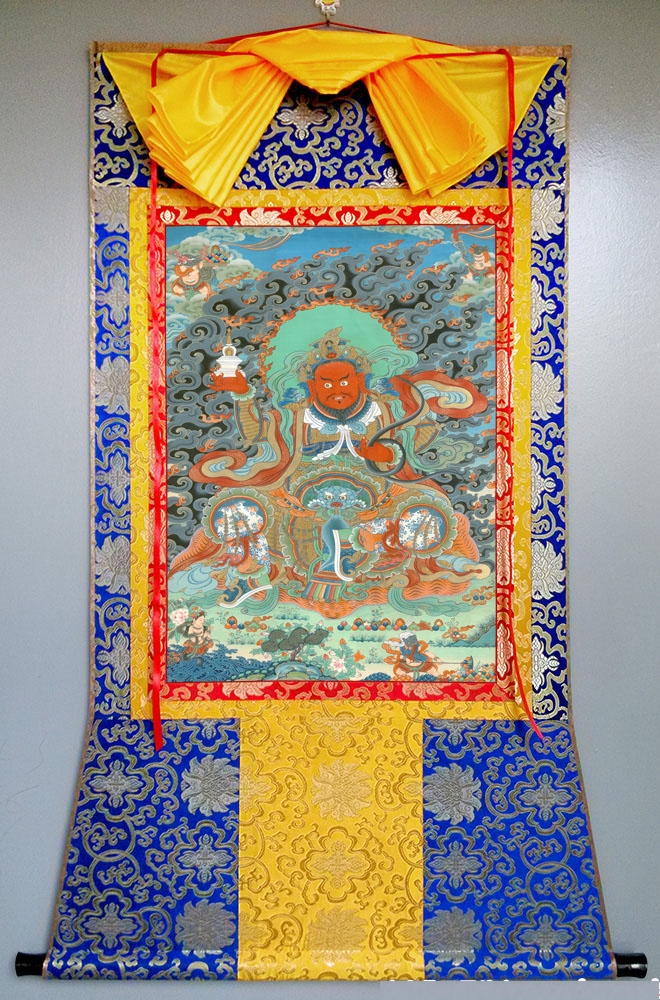 因是佛教圣相,所以我們選用的裝裱材料均是現在能有的最好的裝裱材料,正面選用定制的高檔棉織金絲錦緞很多仿制的是化纖材料,織繡藏傳佛教的富貴蓮花圖案,背面使用加厚仿真絲黃色綢緞布,手工精細裝裱而成,帶掛軸,照面,可直接懸掛到墻上。