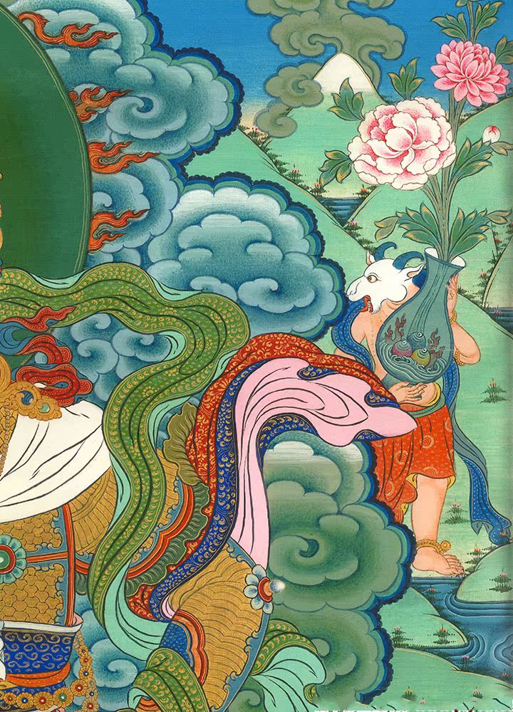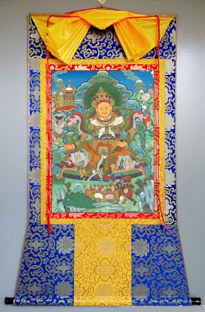 因是佛教圣相,所以我們選用的裝裱材料均是現在能有的最好的裝裱材料,正面選用定制的高檔棉織金絲錦緞很多仿制的是化纖材料,織繡藏傳佛教的富貴蓮花圖案,背面使用加厚仿真絲黃色綢緞布,手工精細裝裱而成,帶掛軸,照面,可直接懸掛到墻上。