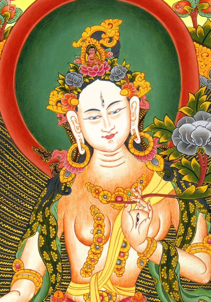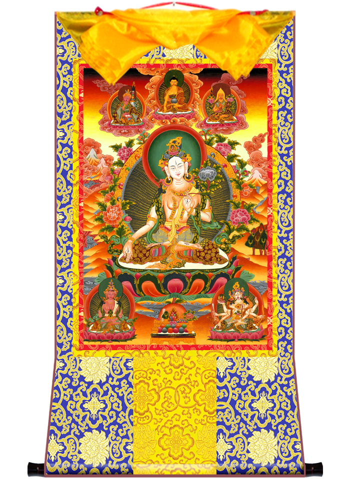 因是佛教圣相,所以我們選用的裝裱材料均是現在能有的最好的裝裱材料,正面選用定制的高檔棉織金絲錦緞很多仿制的是化纖材料,織繡藏傳佛教的富貴蓮花圖案,背面使用加厚仿真絲黃色綢緞布,手工精細裝裱而成,帶掛軸,照面,可直接懸掛到墻上。