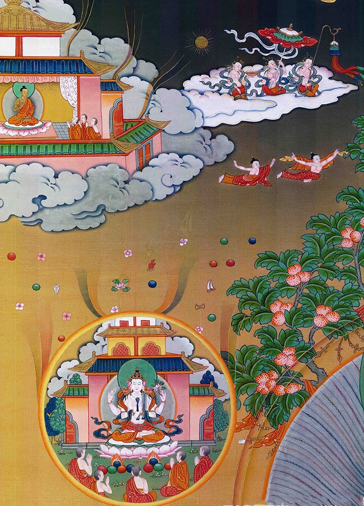 因是佛教圣相,所以我們選用的裝裱材料均是現在能有的最好的裝裱材料,正面選用定制的高檔棉織金絲錦緞很多仿制的是化纖材料,織繡藏傳佛教的富貴蓮花圖案,背面使用加厚仿真絲黃色綢緞布,手工精細裝裱而成,帶掛軸,照面,可直接懸掛到墻上。