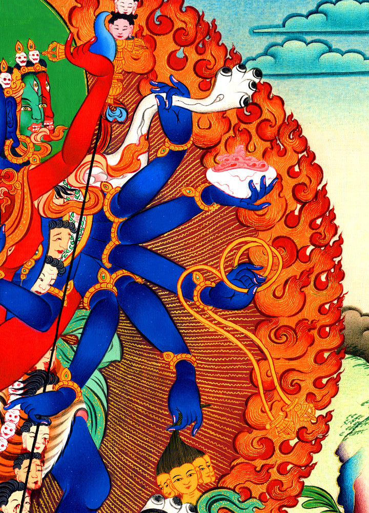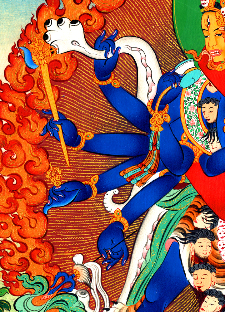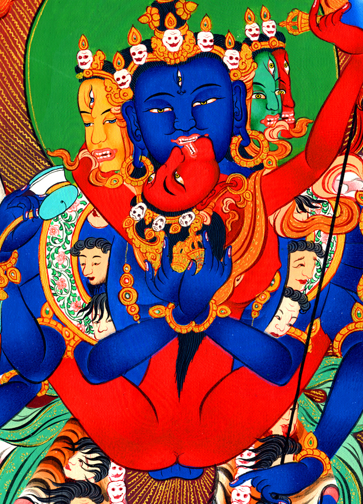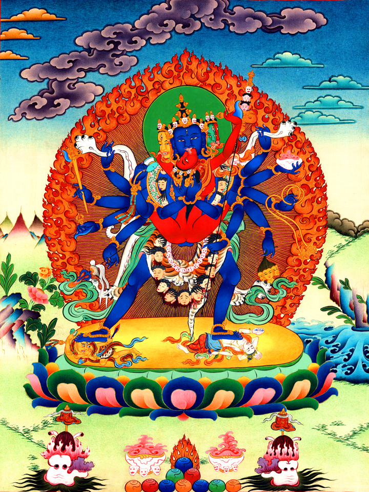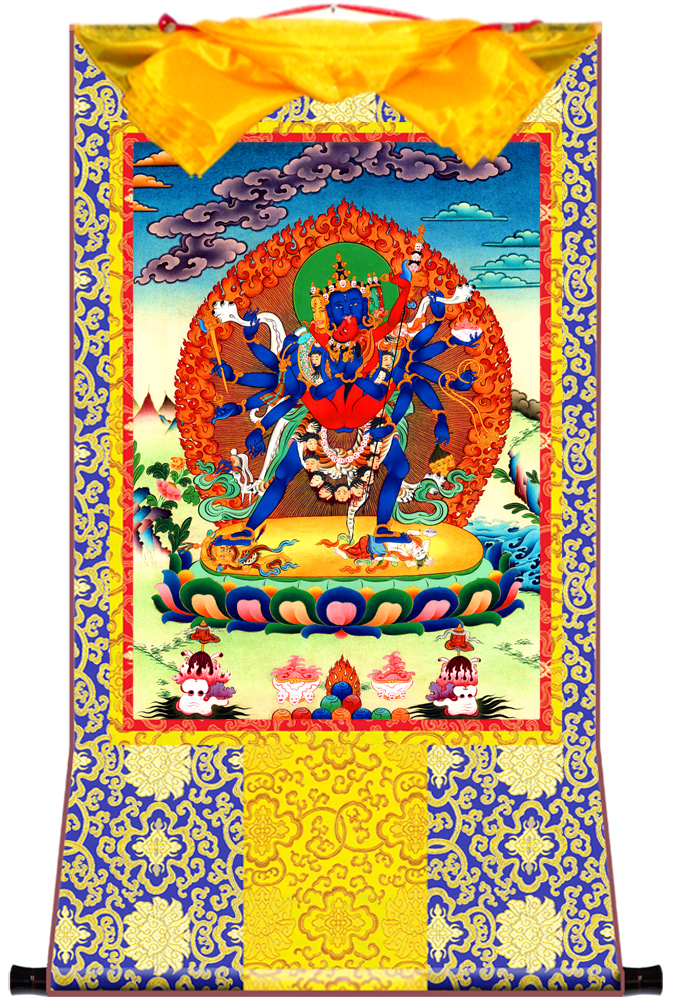 勝樂金剛又稱上樂金剛,梵文 Cakrasamvara,藏語稱“登巧”,蒙古語稱“德穆欽格”,是藏密無上瑜伽部母續的本尊,是三世諸佛的金剛身、語、意所依,是諸佛功德的總集代表,也是藏密無上瑜伽修法中尊奉的五大本尊之一。故稱為總集輪。虔誠供奉修持勝樂金剛,清凈了一切眾生身、語、意的細分業障。得諸佛之功德加持和句義灌頂,堪能成就佛之功德,開顯平等性智,速證佛之自性身。勝樂金剛是佛陀為鎮壓印度教主濕婆,而化現勝樂62尊憤怒相,傳給佛弟子。在無上密續中,屬于母續法,勝樂也被尊稱為母續之王,為億萬空行總主。 |