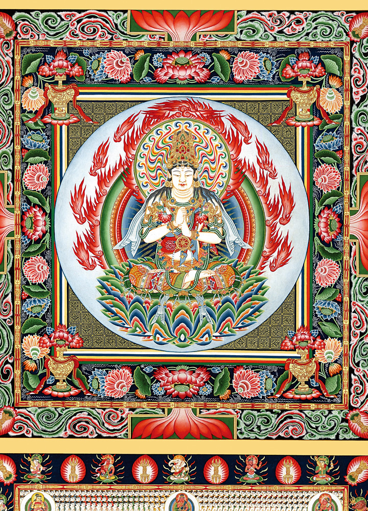 因是佛教圣相,所以我們選用的裝裱材料均是現在能有的最好的裝裱材料,正面選用定制的高檔棉織金絲錦緞很多仿制的是化纖材料,織繡藏傳佛教的富貴蓮花圖案,背面使用加厚仿真絲黃色綢緞布,手工精細裝裱而成,帶掛軸,照面,可直接懸掛到墻上。