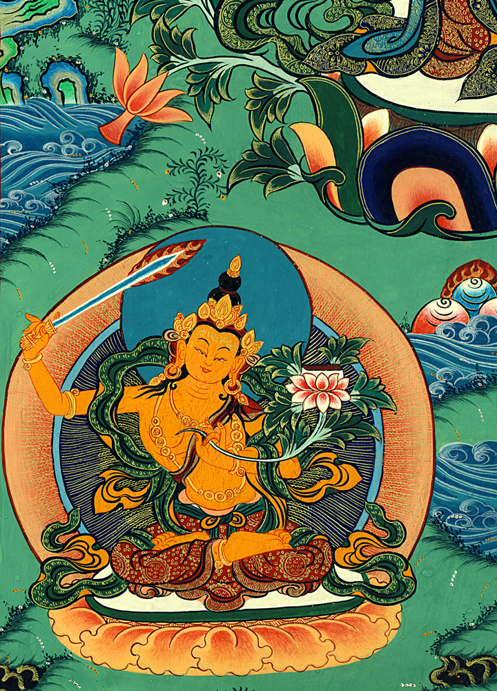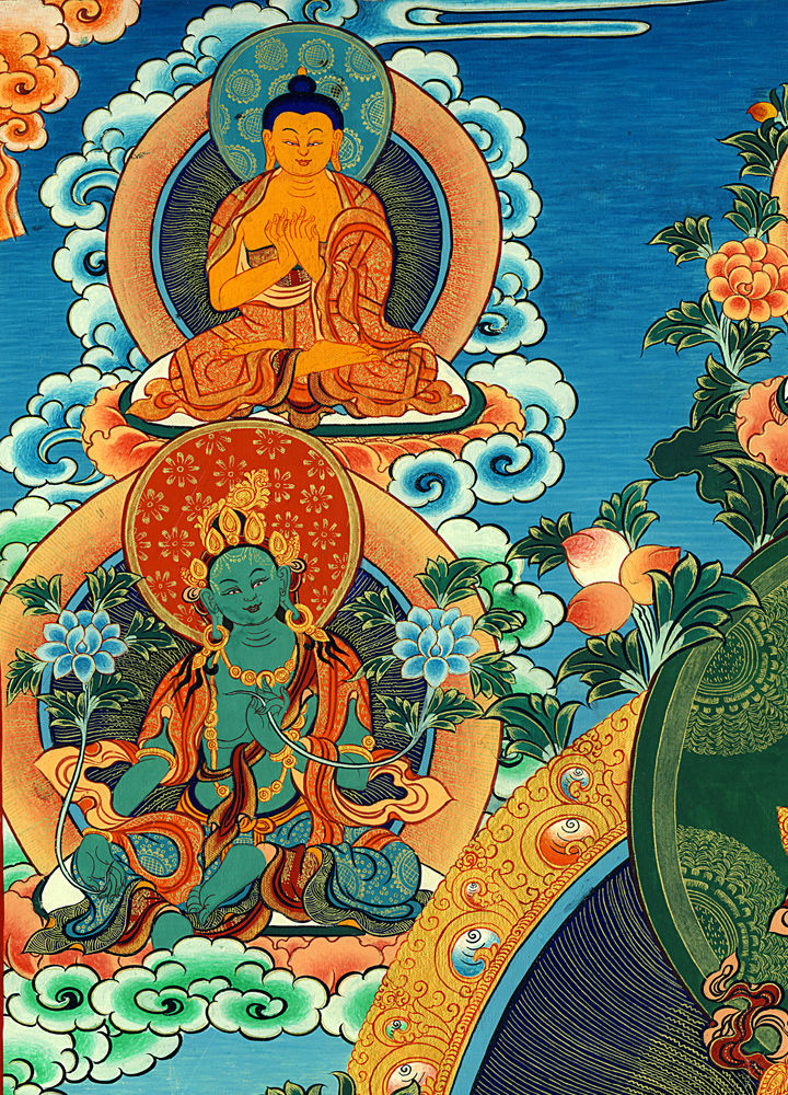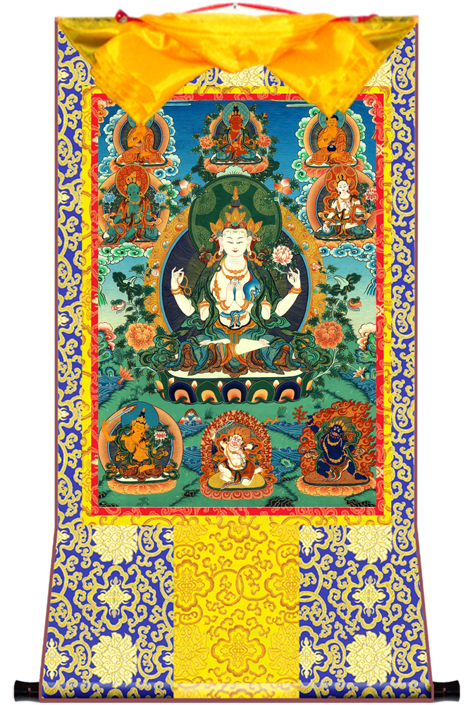因是佛教圣相,所以我們選用的裝裱材料均是現在能有的最好的裝裱材料,正面選用定制的高檔棉織金絲錦緞很多仿制的是化纖材料,織繡藏傳佛教的富貴蓮花圖案,背面使用加厚仿真絲黃色綢緞布,手工精細裝裱而成,帶掛軸,照面,可直接懸掛到墻上。