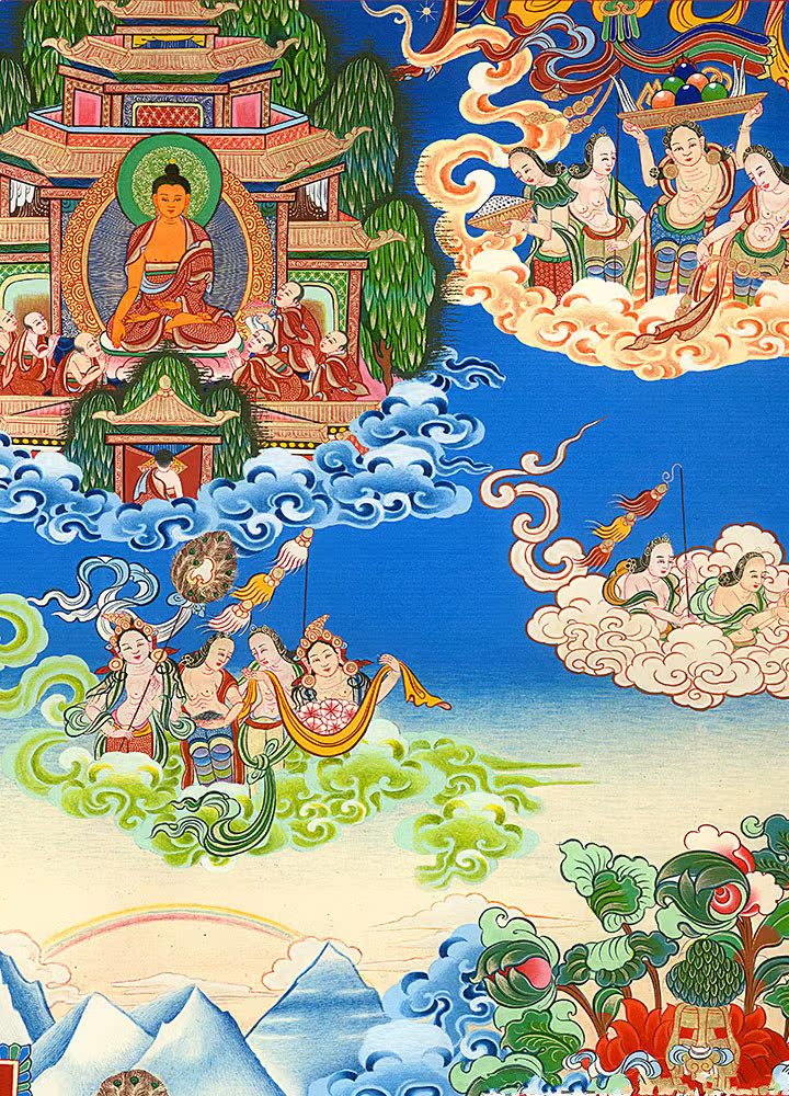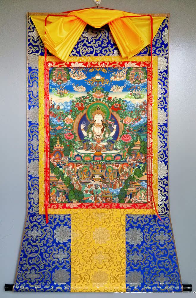 因是佛教圣相,所以我們選用的裝裱材料均是現在能有的最好的裝裱材料,正面選用定制的高檔棉織金絲錦緞很多仿制的是化纖材料,織繡藏傳佛教的富貴蓮花圖案,背面使用加厚仿真絲黃色綢緞布,手工精細裝裱而成,帶掛軸,照面,可直接懸掛到墻上。