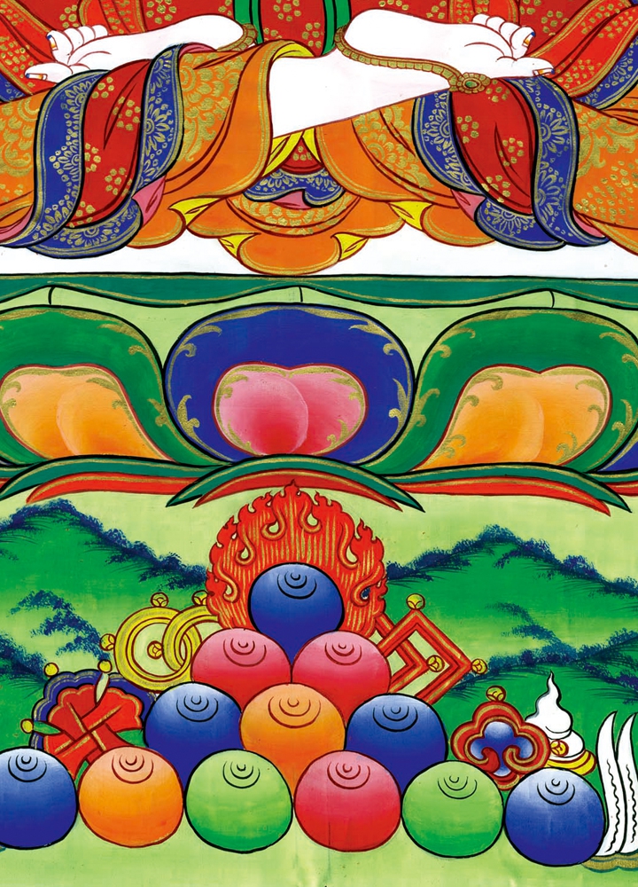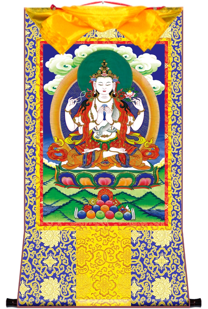 因是佛教圣相,所以我們選用的裝裱材料均是現在能有的最好的裝裱材料,正面選用定制的高檔棉織金絲錦緞很多仿制的是化纖材料,織繡藏傳佛教的富貴蓮花圖案,背面使用加厚仿真絲黃色綢緞布,手工精細裝裱而成,帶掛軸,照面,可直接懸掛到墻上。