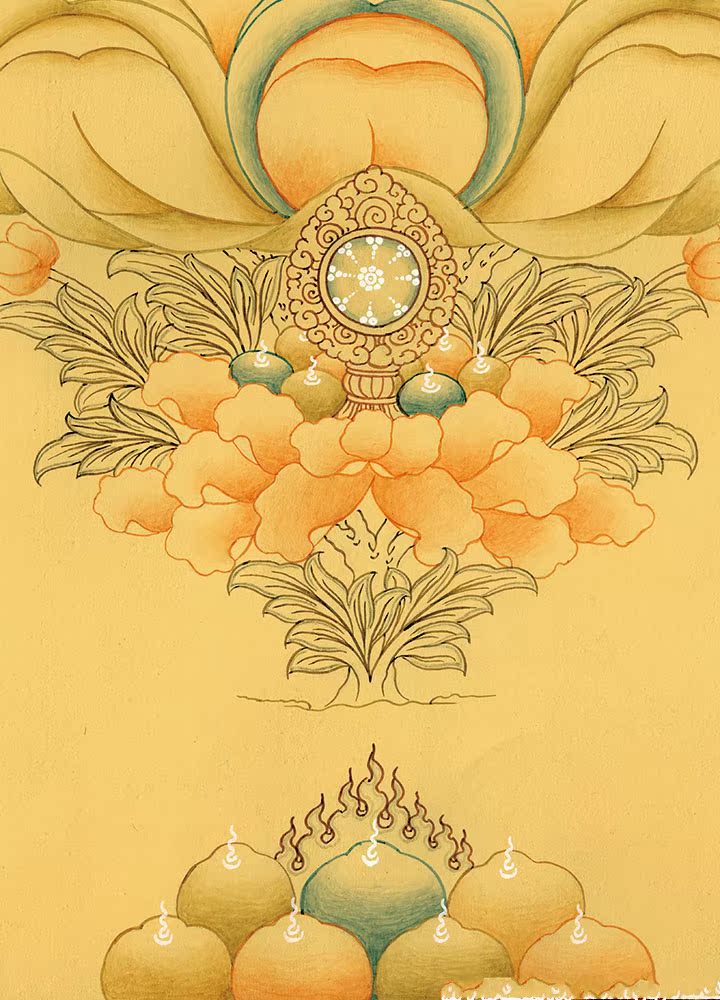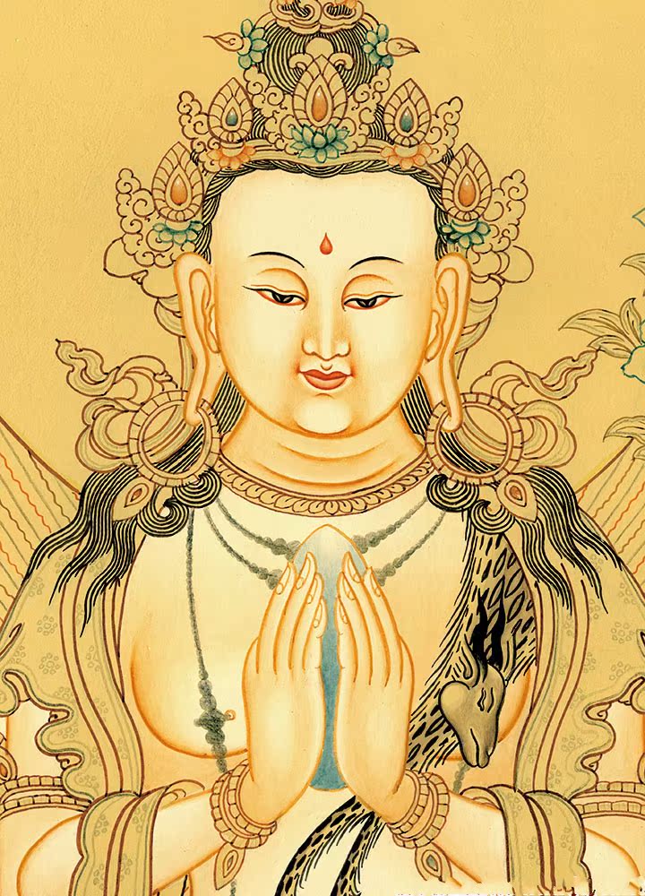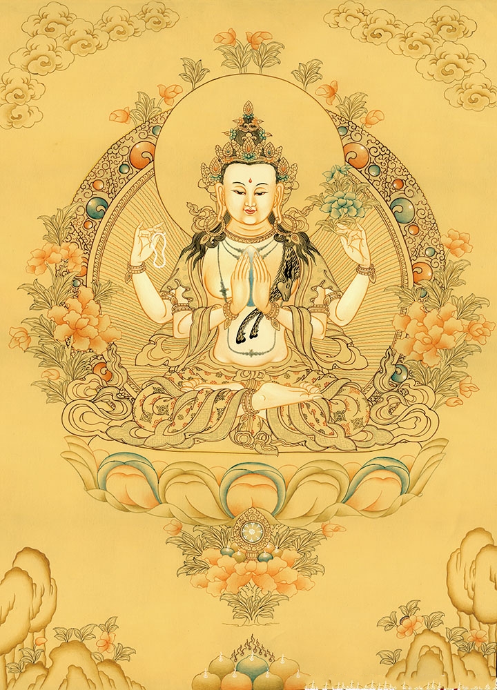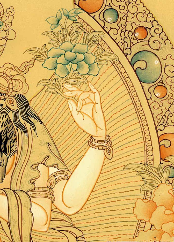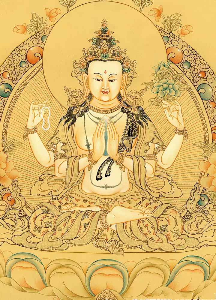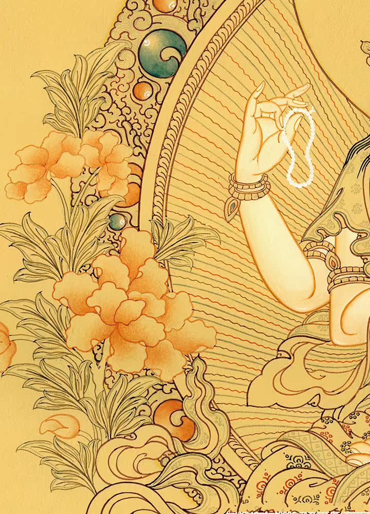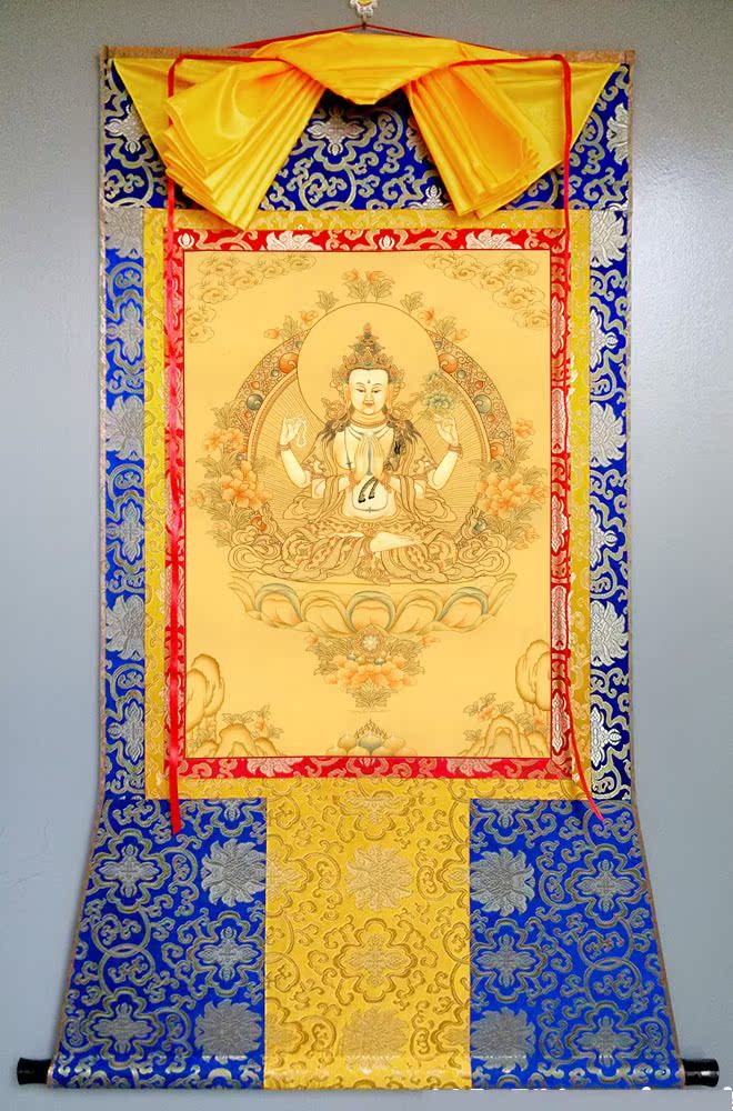 因是佛教圣相,所以我們選用的裝裱材料均是現在能有的最好的裝裱材料,正面選用定制的高檔棉織金絲錦緞很多仿制的是化纖材料,織繡藏傳佛教的富貴蓮花圖案,背面使用加厚仿真絲黃色綢緞布,手工精細裝裱而成,帶掛軸,照面,可直接懸掛到墻上。