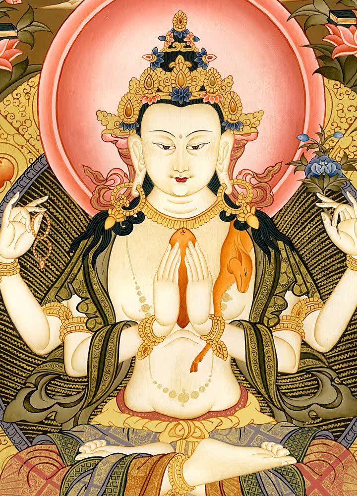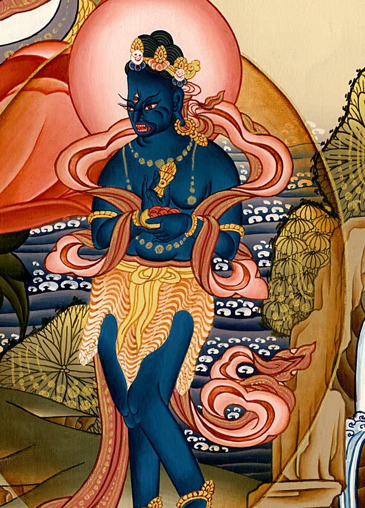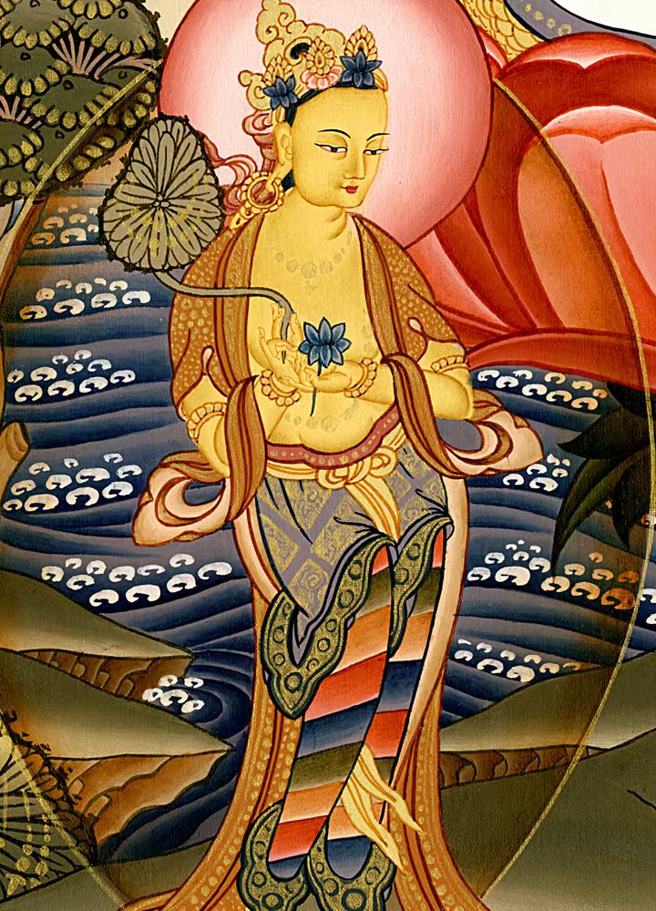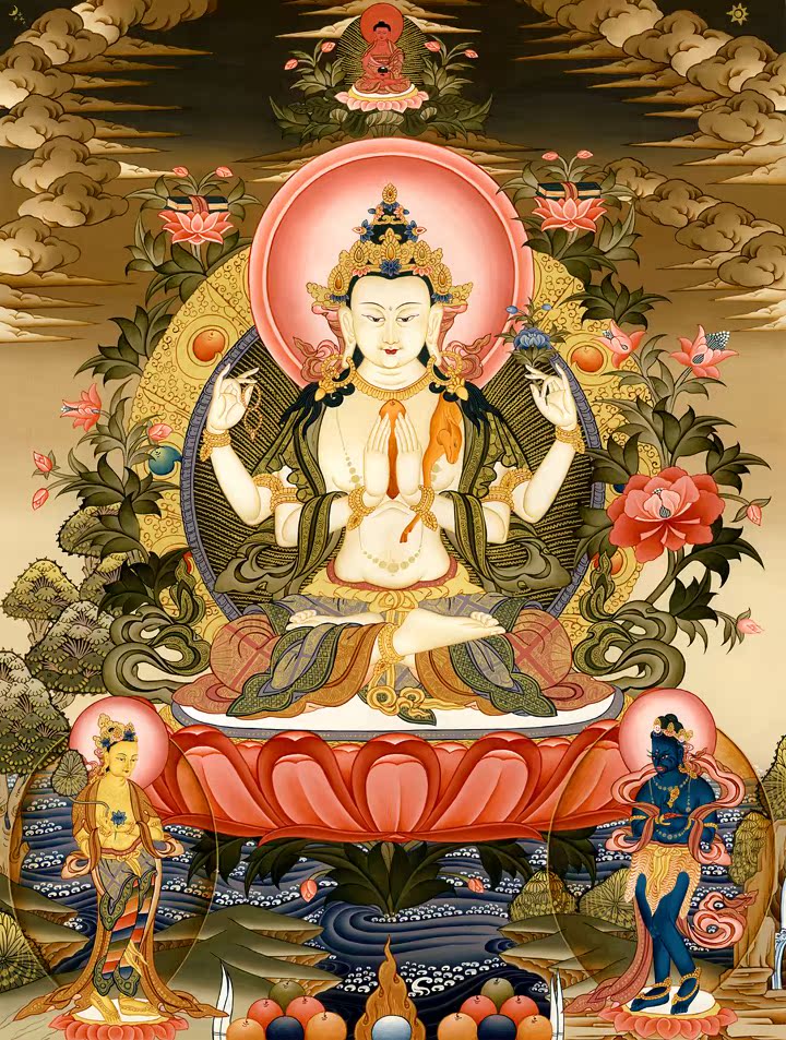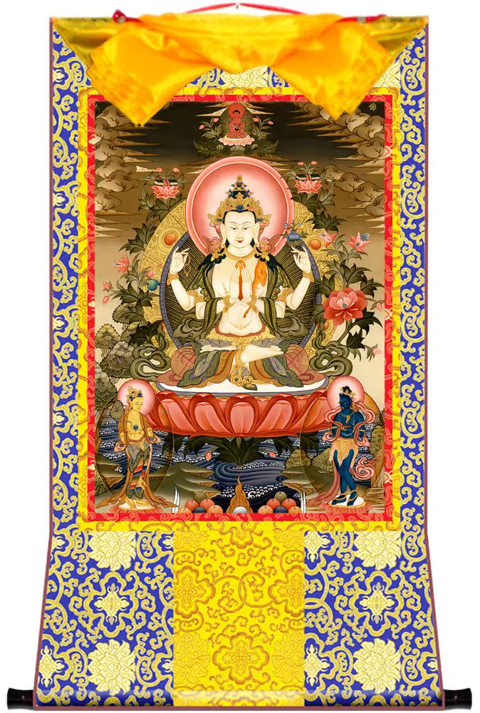 因是佛教圣相,所以我們選用的裝裱材料均是現在能有的最好的裝裱材料,正面選用定制的高檔棉織金絲錦緞很多仿制的是化纖材料,織繡藏傳佛教的富貴蓮花圖案,背面使用加厚仿真絲黃色綢緞布,手工精細裝裱而成,帶掛軸,照面,可直接懸掛到墻上。