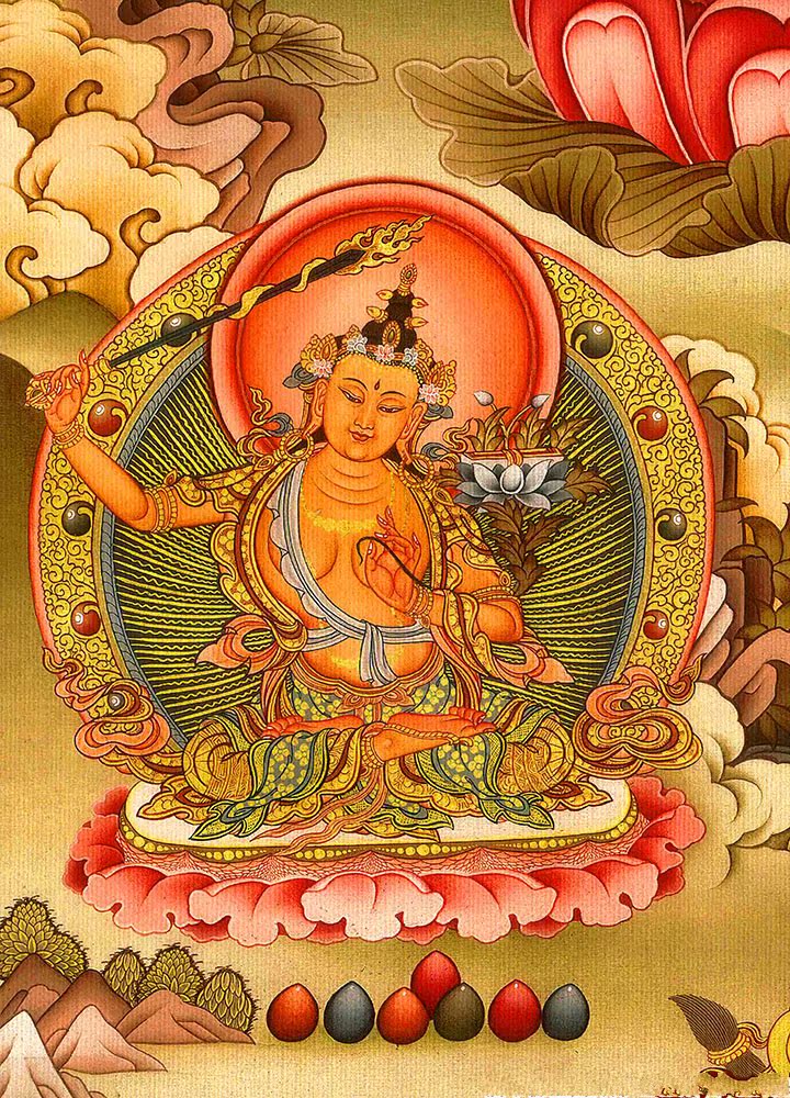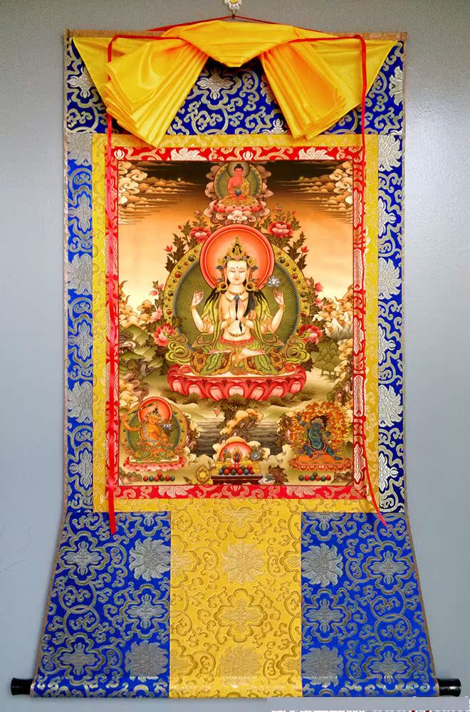 因是佛教圣相,所以我們選用的裝裱材料均是現在能有的最好的裝裱材料,正面選用定制的高檔棉織金絲錦緞很多仿制的是化纖材料,織繡藏傳佛教的富貴蓮花圖案,背面使用加厚仿真絲黃色綢緞布,手工精細裝裱而成,帶掛軸,照面,可直接懸掛到墻上。