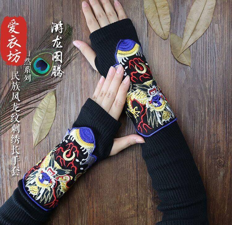 1006黑色均碼原創民族風繡花楊麗萍同款半指手套中國風女式長臂露指手套護腕女