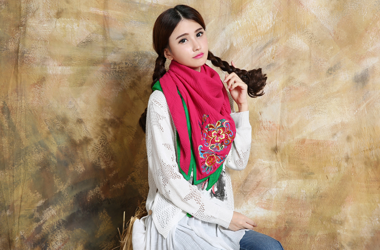 1005手套一對復古民族風繡花女士圍巾披肩秋冬新款棉麻撞色流蘇兩用三角巾