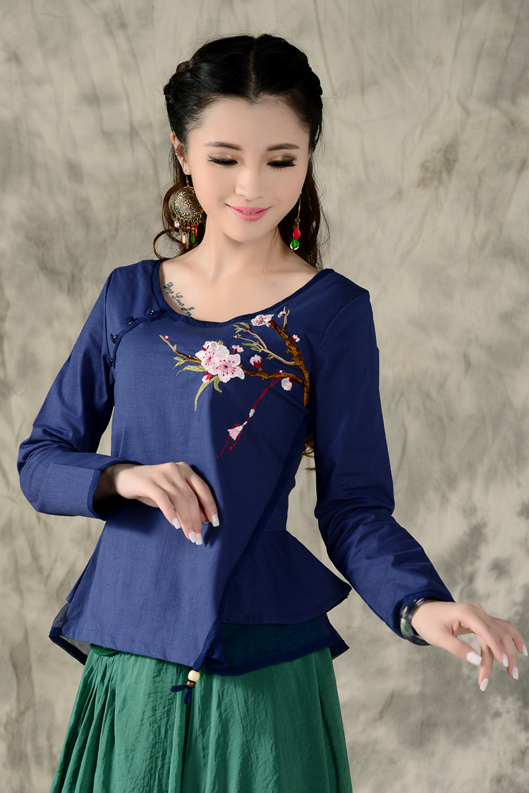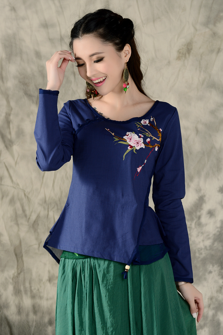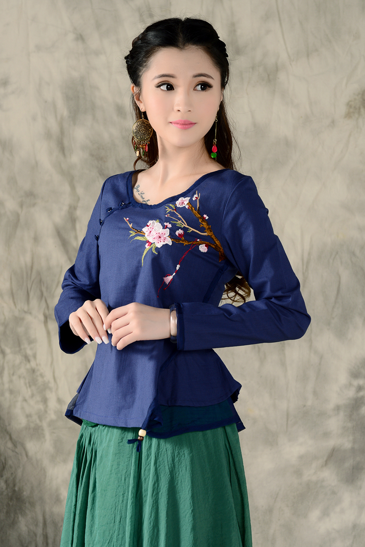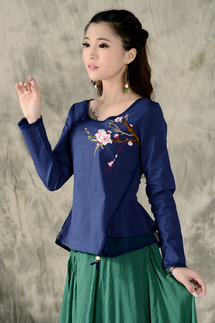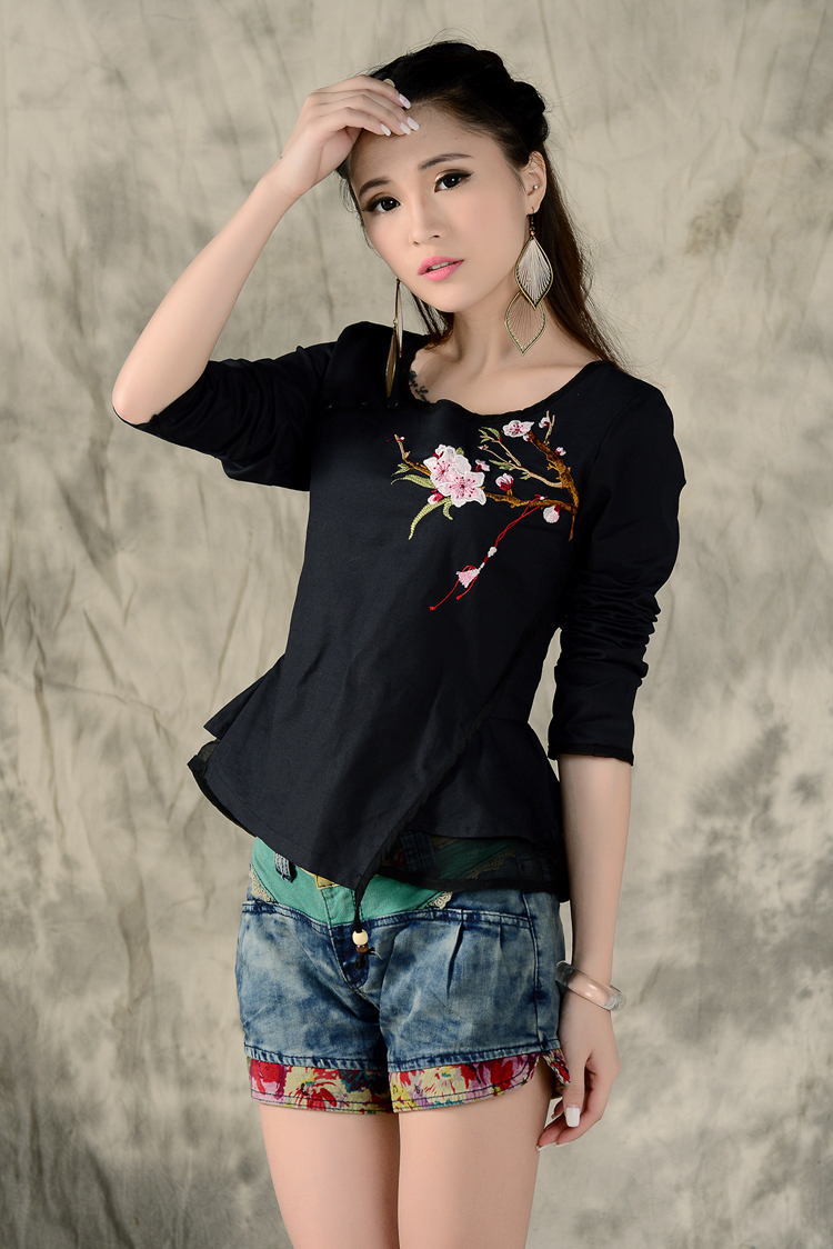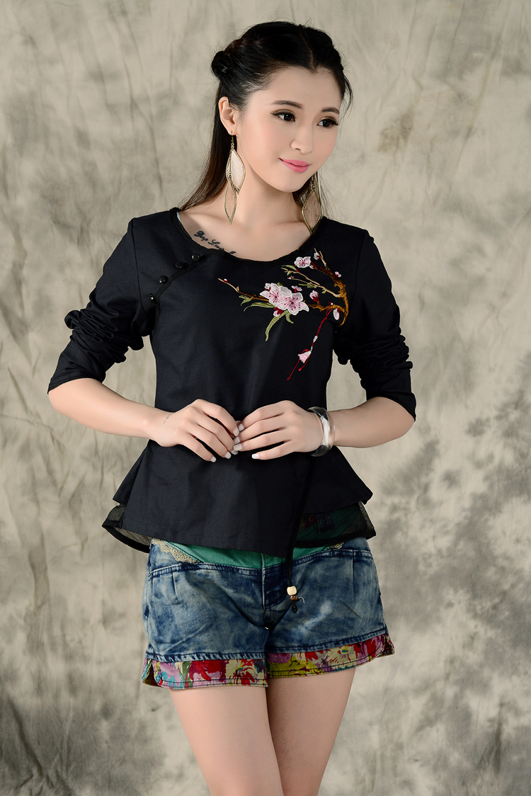 黑色XL秋裝民族風新款長袖繡花特色襯衣女裝 亞麻修身棉麻繡花套頭襯衫