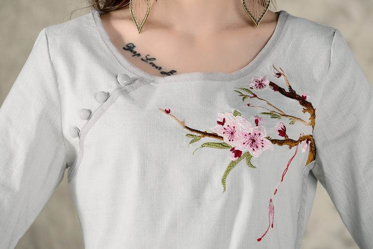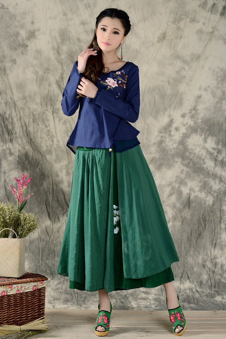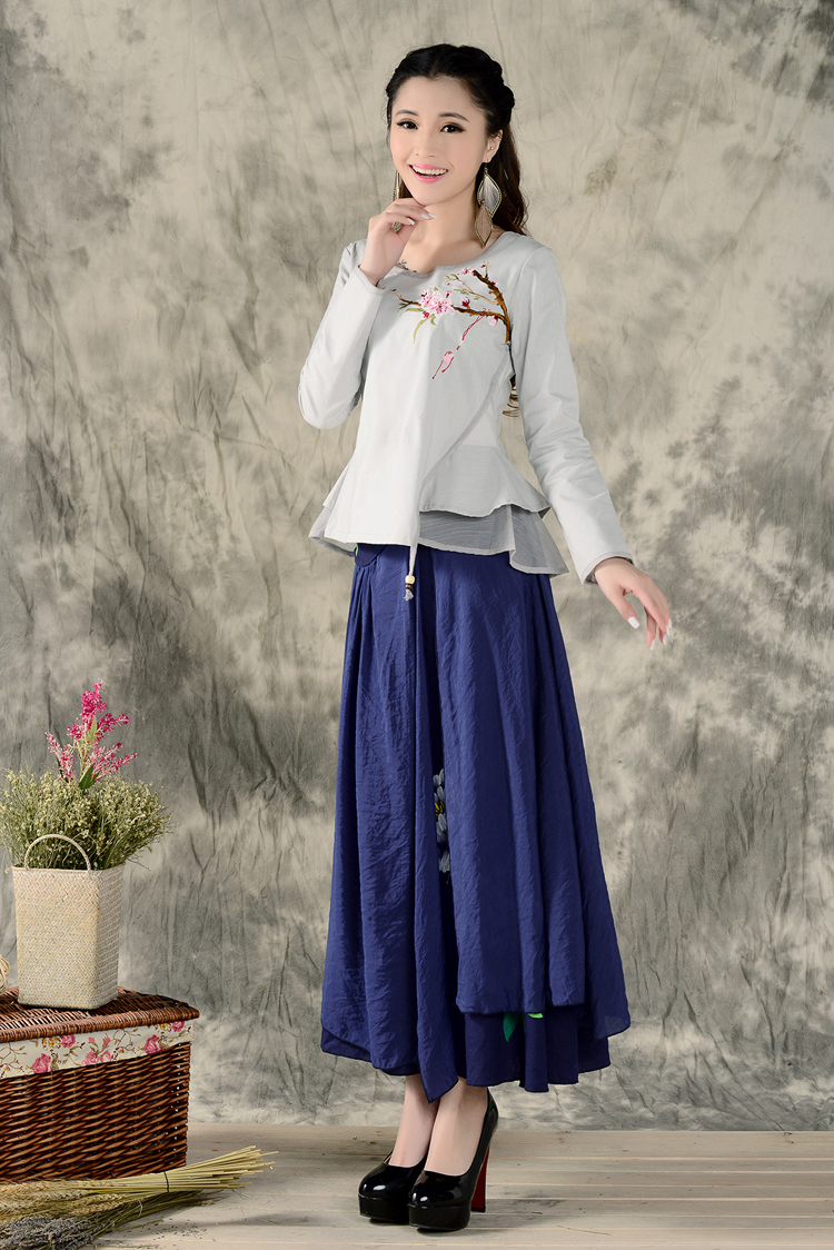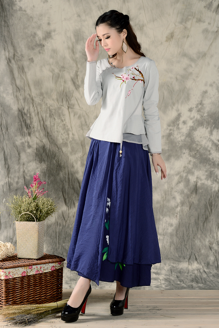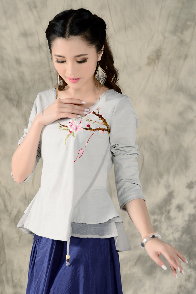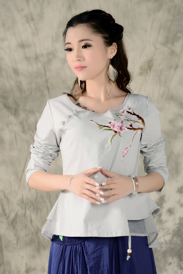 黑色XL秋裝民族風新款長袖繡花特色襯衣女裝 亞麻修身棉麻繡花套頭襯衫