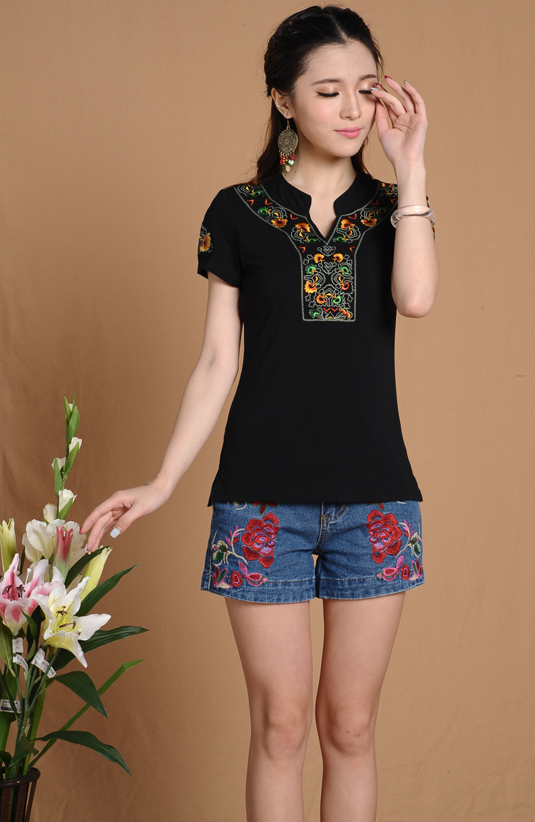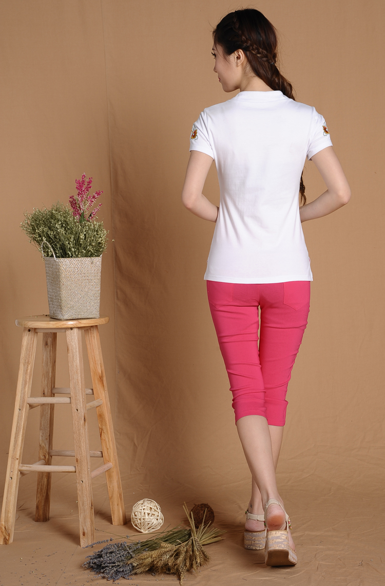白色M2016夏季側開衩下擺 修身 繡花 棉質 立領短袖女t恤 有內襯