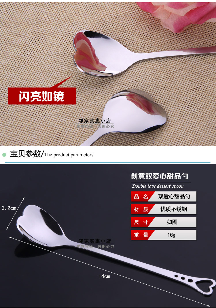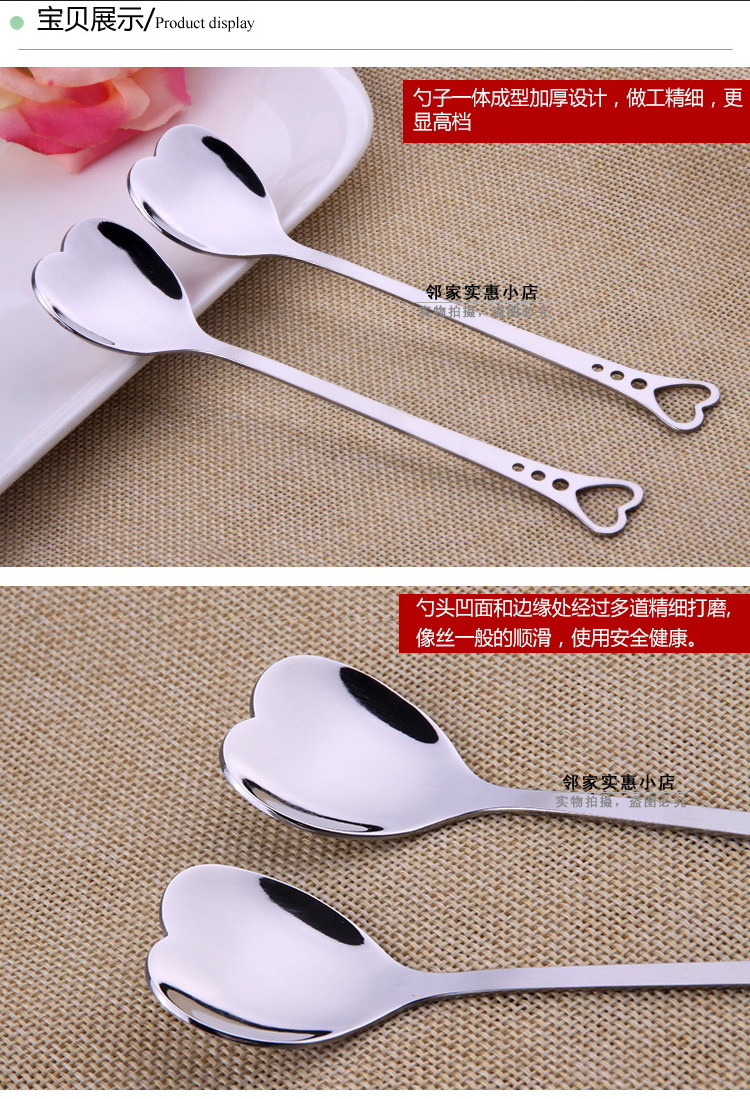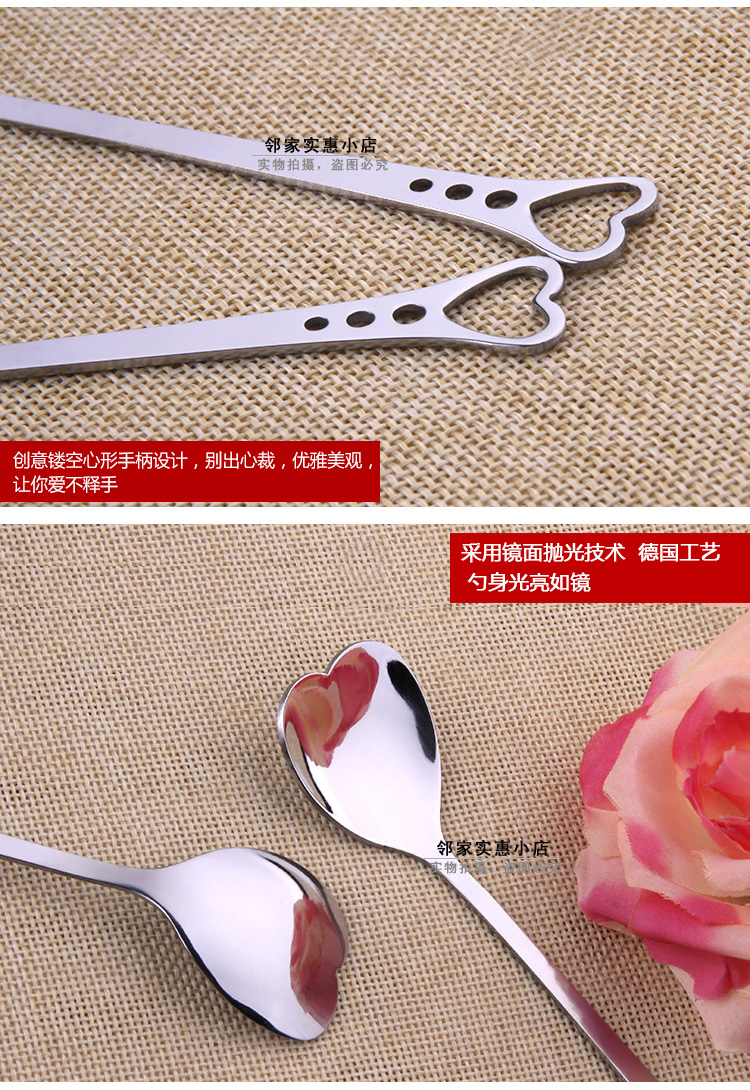 優美的餐具,勺子擁有鏡面般的光澤。非常創意的設計,手柄和勺頭都是心形設計,宛如一件藝術品。勺頭加厚鋼制,厚度達1mm,圓潤光滑口感更好。吃甜品,雪糕,喝咖啡,奶茶統統都都可以,拿起它,優雅的享受下午茶吧。