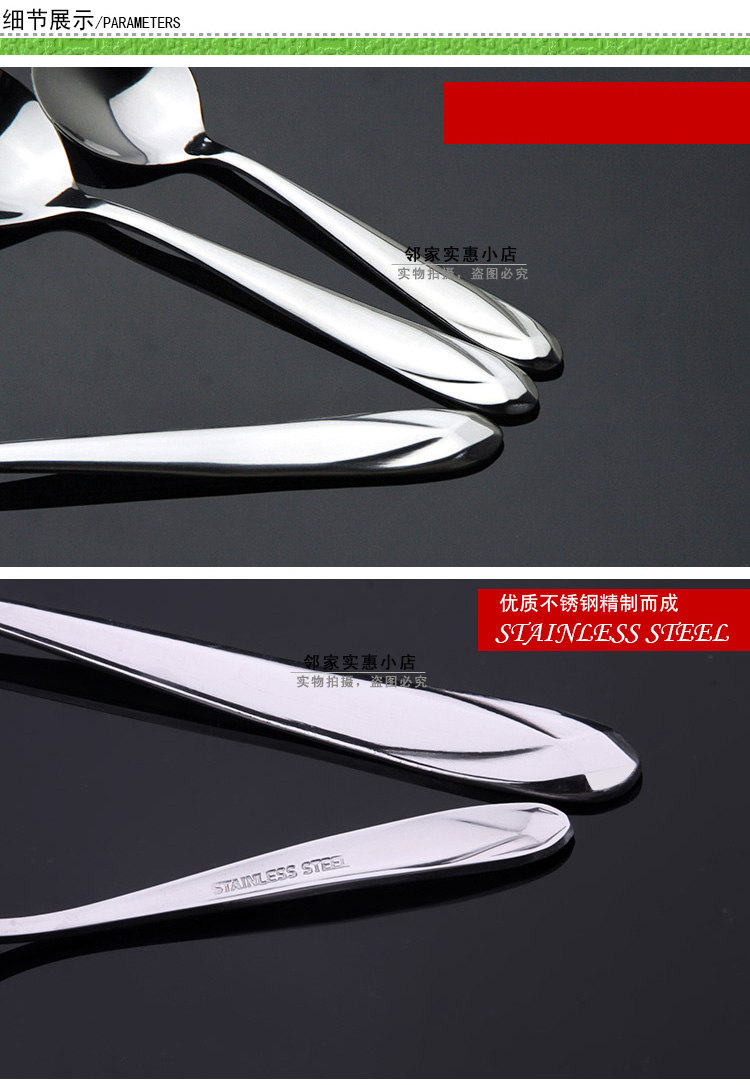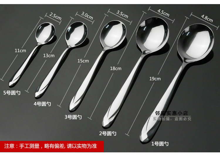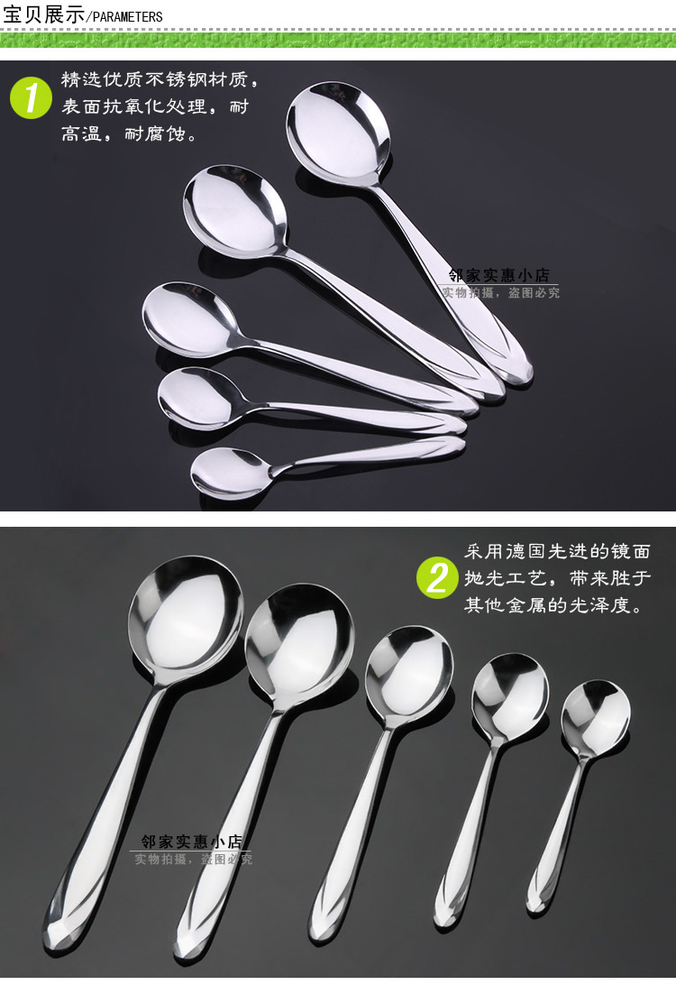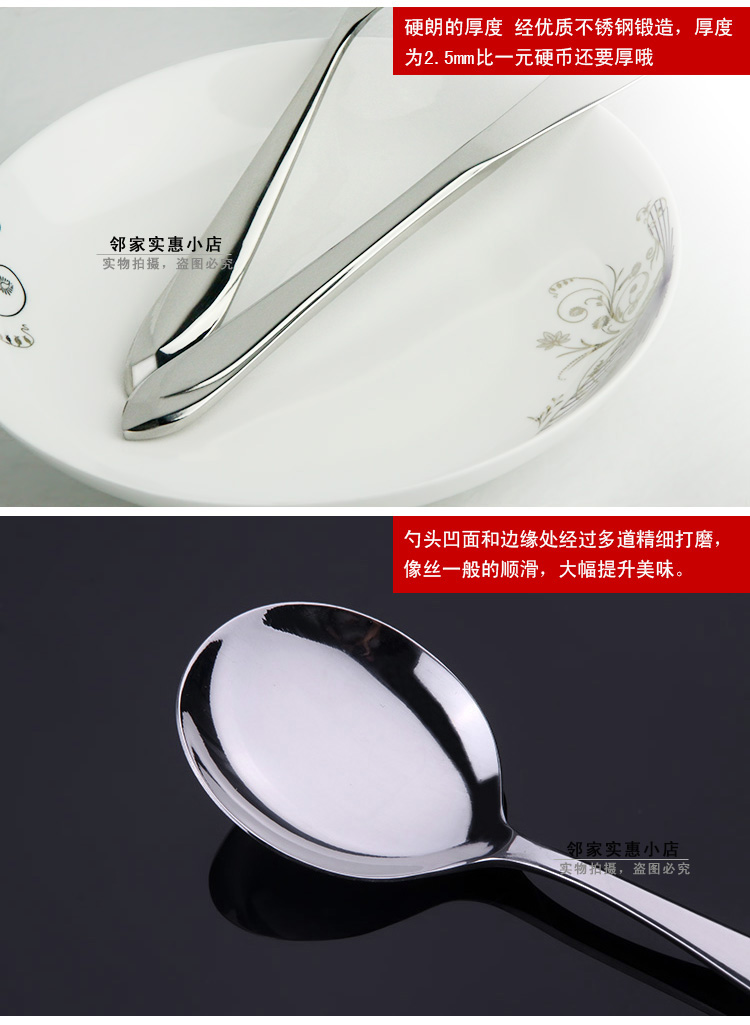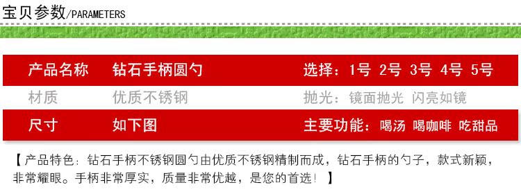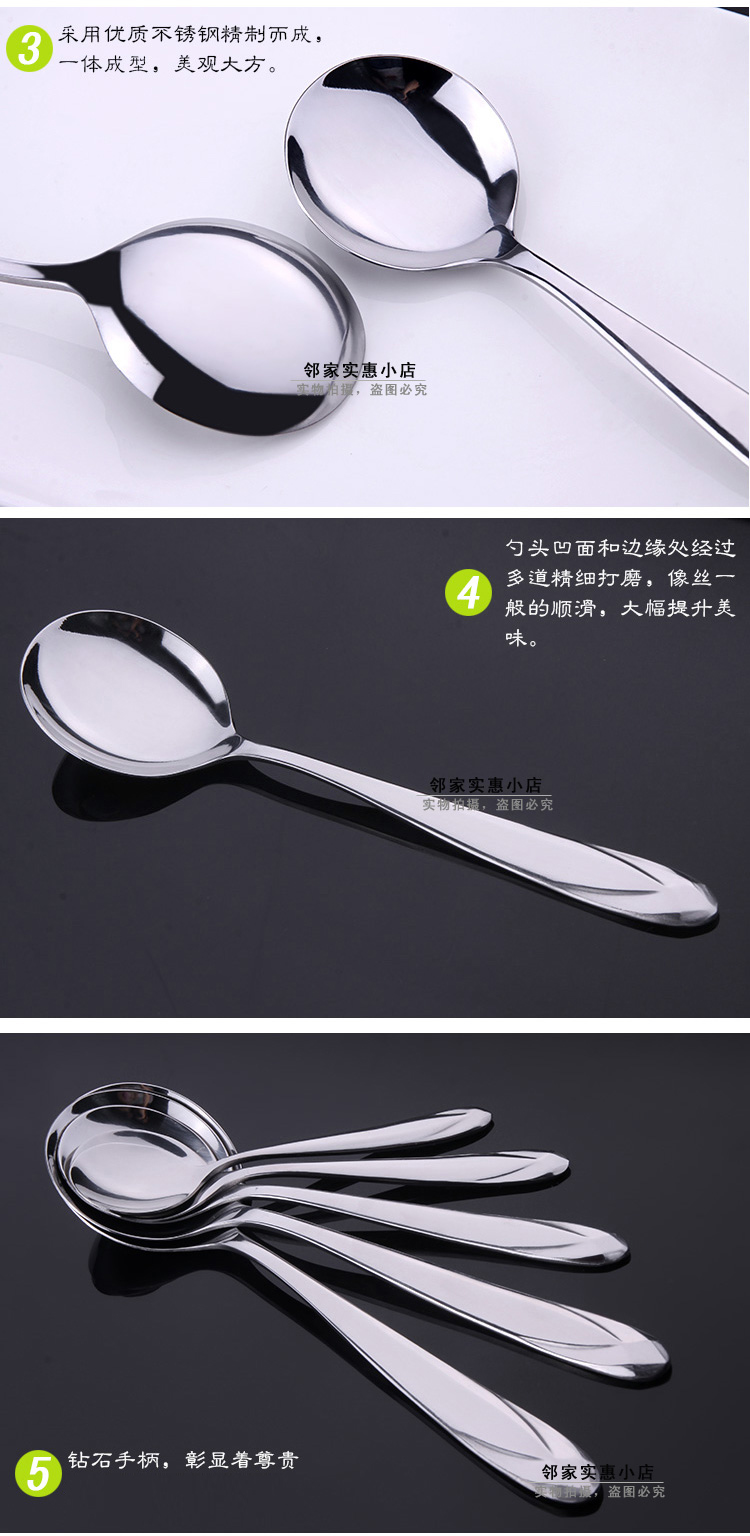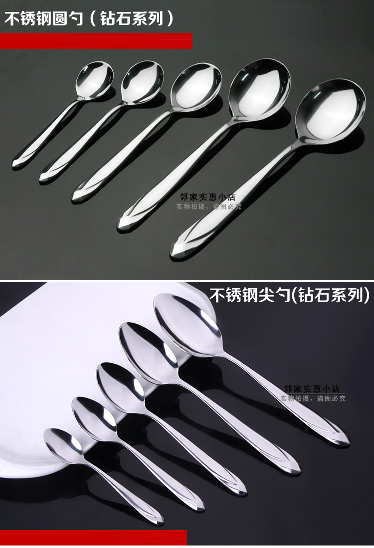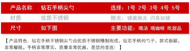 6個!超值!鉆石手柄不銹鋼圓勺子由優質不銹鋼精制而成,鉆石手柄的勺子,款式新穎,非常耀眼。手柄非常厚實,質量非常優越,是您的首選!手柄厚度為2.5mm,比一硬幣還要厚哦,如此厚重的勺子,您值得擁有。
