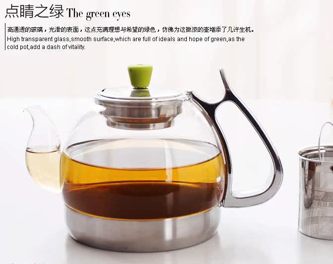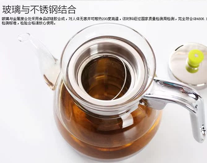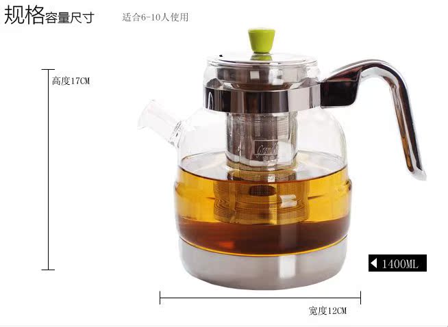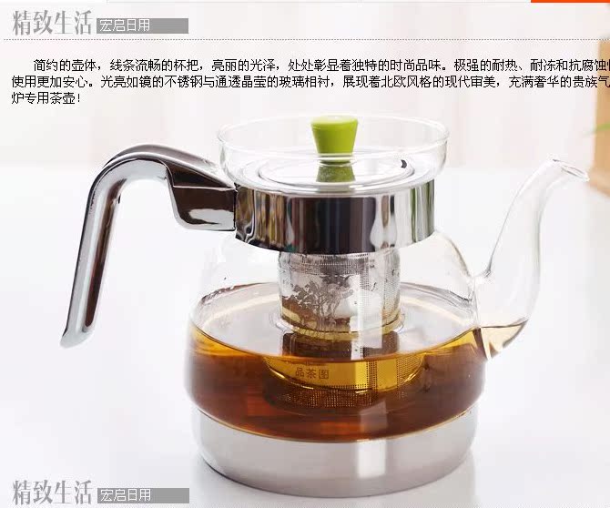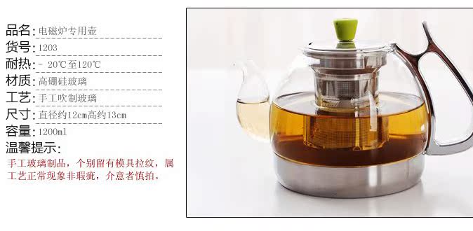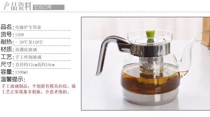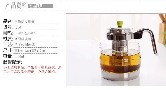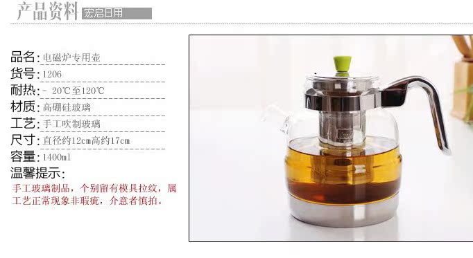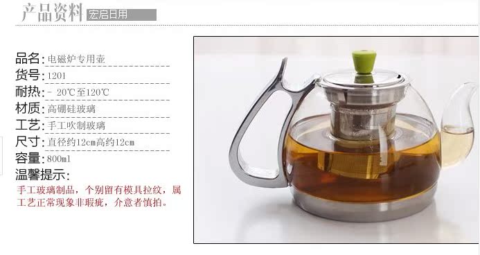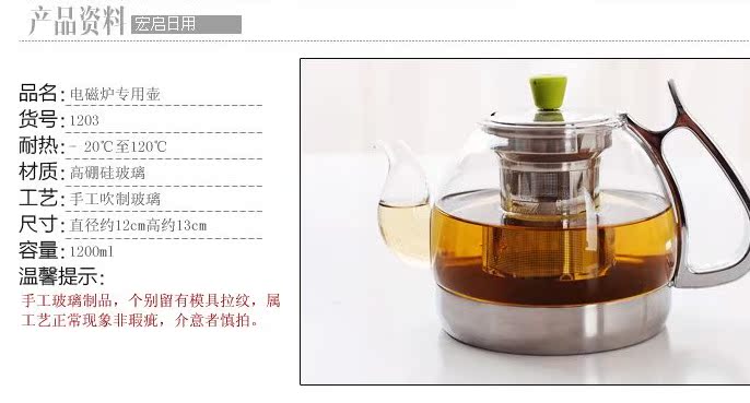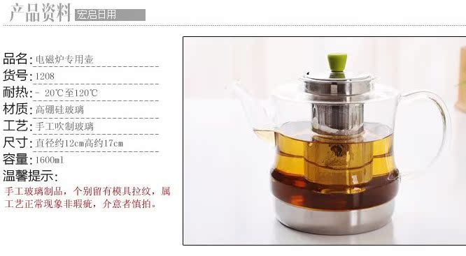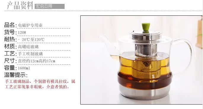 【產品特點】: 此產品可以在電磁爐上使用電磁爐功率?1500W。此產品采用高端技術,以不銹鋼底座粘玻璃壺身,塑料手柄不燙手,不銹鋼蓋子,過濾網是鋼板沖孔網。融入了實用與健康的結合。 【特別介紹】: 本產品玻璃部分采用高硼硅燈光管玻璃料,人工吹制而成。純度高亮度好,耐腐蝕性高而更健康環保,機械強度高而更安全,是一般高硼硅玻璃無法相比的。人工吹制的工藝,使產品無模痕,晶瑩剔透,更是一般的機吹產品無法達到的。 【材質】: 1.玻璃部分:膨脹系數為3.3高硼硅綠色環保玻璃,瞬間極變溫差:-20℃至180℃。 2.五金部分:優質不銹鋼 3.塑料部分手柄:全新環保級ABS塑料,多層環保絡電鍍 【功能特點】: 1.此產品可以在電磁爐,煤氣爐,酒精爐,電爐等加熱工具上進行加熱,也可從冰箱拿出,立即倒入沸騰的水而不炸裂。 2.不銹鋼底座可避免外界的沖擊和碰撞。 3.玻璃壺身,采用高硼硅耐高溫綠色環保玻璃,人工吹制,晶瑩剔透,質感好。具有較強的機械強度,及對急冷急熱溫度變化有很強的性能表現。耐腐蝕性很強。容易清洗,且不吸附茶的味道。 4.壺內帶有不銹鋼鋼板沖孔過濾網,規正美觀,不銹鋼濾網可隨意取放,更容易調節茶湯的濃淡 5.手柄是塑料的,不燙手,使用更安全。 6.簡易的可拆卸式設計,更是便于清洗 7.本產品容量是1100毫升 8.有廠家提供的精美包裝盒 9.本產品適合煮咖啡,煮雞蛋,燒開水,熱牛奶、飲料等等,也可沖泡各種草茶,花茶等等,是一款多用壺。 10.是辦公室,家庭,茶藝館,酒店等場所煮咖啡、飲茶器皿的最佳選擇 【注意事項】: 特別注意:使用電磁爐,電磁爐的功率不要超過1500W 1.第一次使用時,請用中性清潔劑清洗干凈后,注入純凈水煮沸騰3分鐘倒掉,再次加入純凈水方可使用。 2.使用酒精爐等明火爐加熱時,火焰大小不要超過壺底部,以免燒壞手柄。 3.避免孩童使用本產品,以免燙傷,劃傷玻璃部分易碎 4.不可空燒 5.清洗時請使用柔軟的清潔棉和中性清潔劑,禁止使用鋼刷或有顆粒的洗滌劑本品屬易碎品,請小心清洗 6使用時避免強烈的沖擊和碰撞玻璃部分易碎 ![]() |