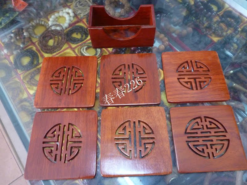 品名:越南草花梨雕花鑲貝鏤空囍字方形杯墊