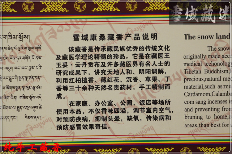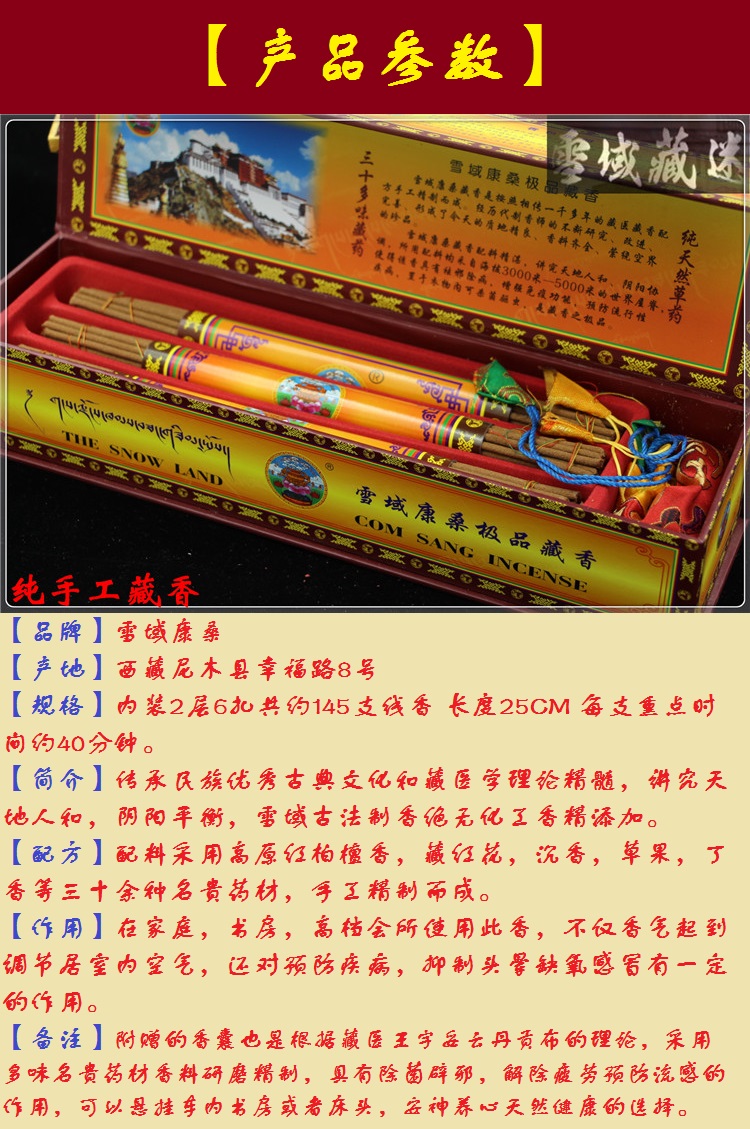 本公司大部分商品6一10天到貨。不接急單。急單的客戶請不要下單。感謝諒解與合作! ![]() ![]() ![]() ![]() ![]() ![]() ![]() ![]() ![]() ![]() 【品牌】雪域康桑【產地】尼木縣幸福路8號 【規格】內裝2層6扎共約145支線香 長度25CM 每支熏點時間約40分鐘。 【簡介】傳承民族優秀古典文化和藏醫學理論精髓,講究天地人和,陰陽平衡,雪域古法制香絕無化工香精添加。 【配方】配料采用高原紅柏檀香,藏紅花,沉香,草果,丁香等三十余種名貴藥材,手工精制而成。 【作用】在家庭,書房,高檔會所使用此香,不僅香氣起到調節居室內空氣,還對預防疾病,抑制頭暈缺氧感冒有一定的作用。 【備注】附贈的香囊也是根據藏醫王宇妥云丹貢布的理論,采用多味名貴藥材香料研磨精制,具有除菌辟邪,解除疲勞預防流感的作用,可以懸掛車內書房或者床頭,安神養心天然健康的選擇。 |