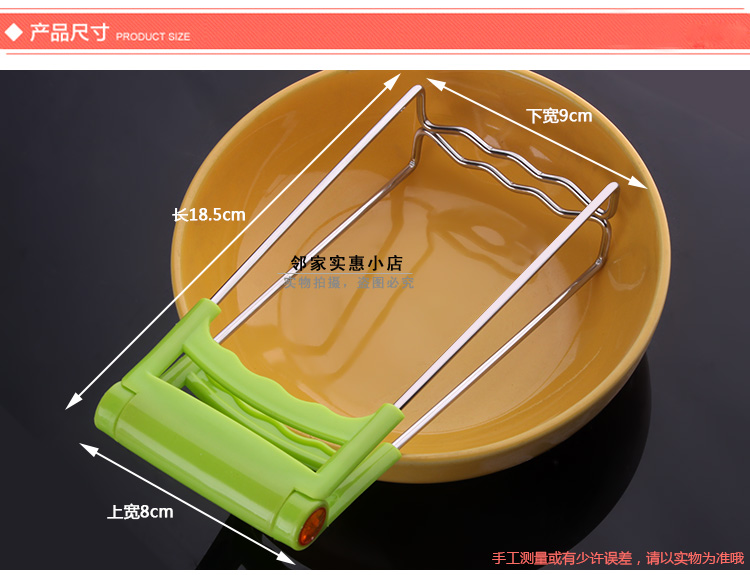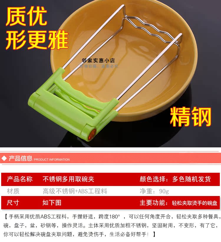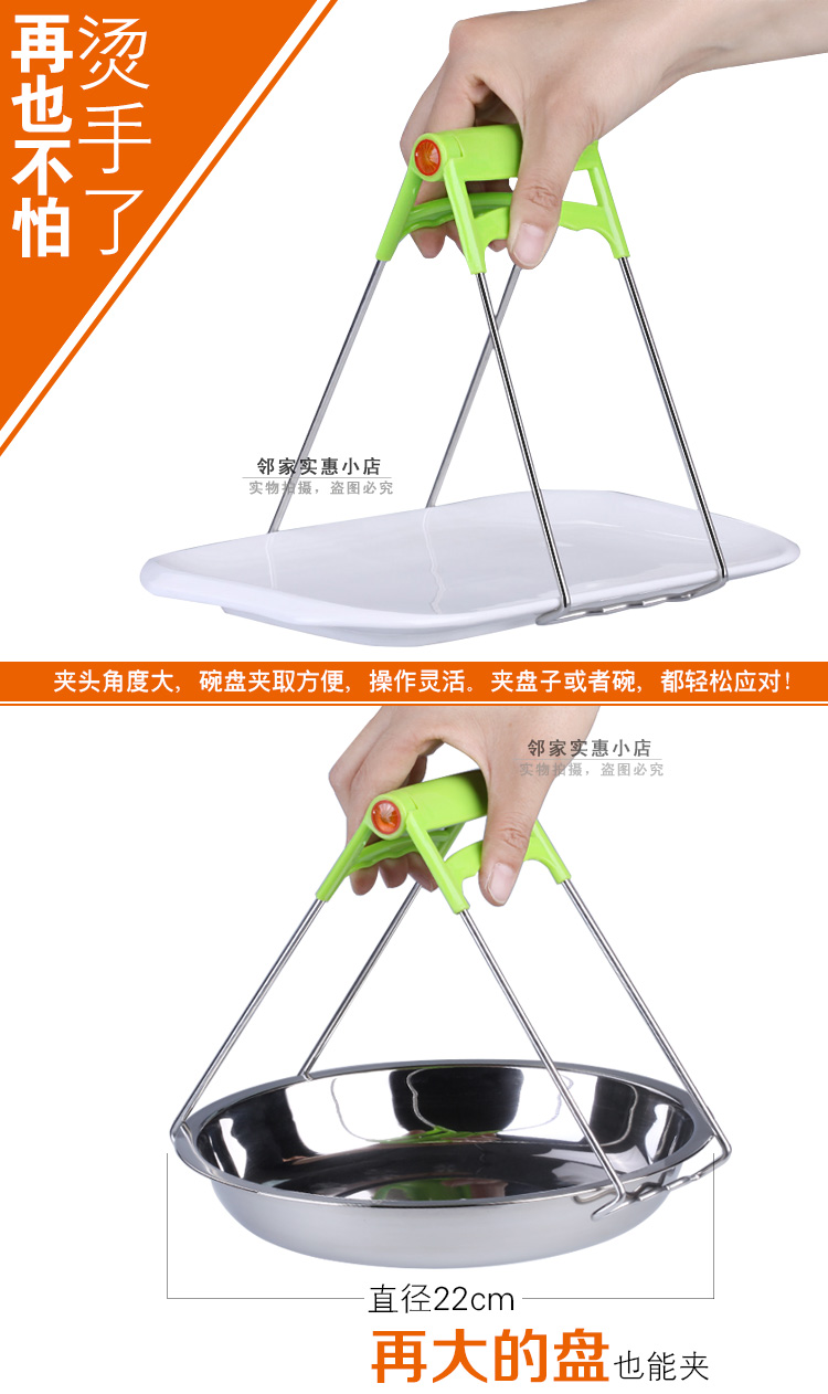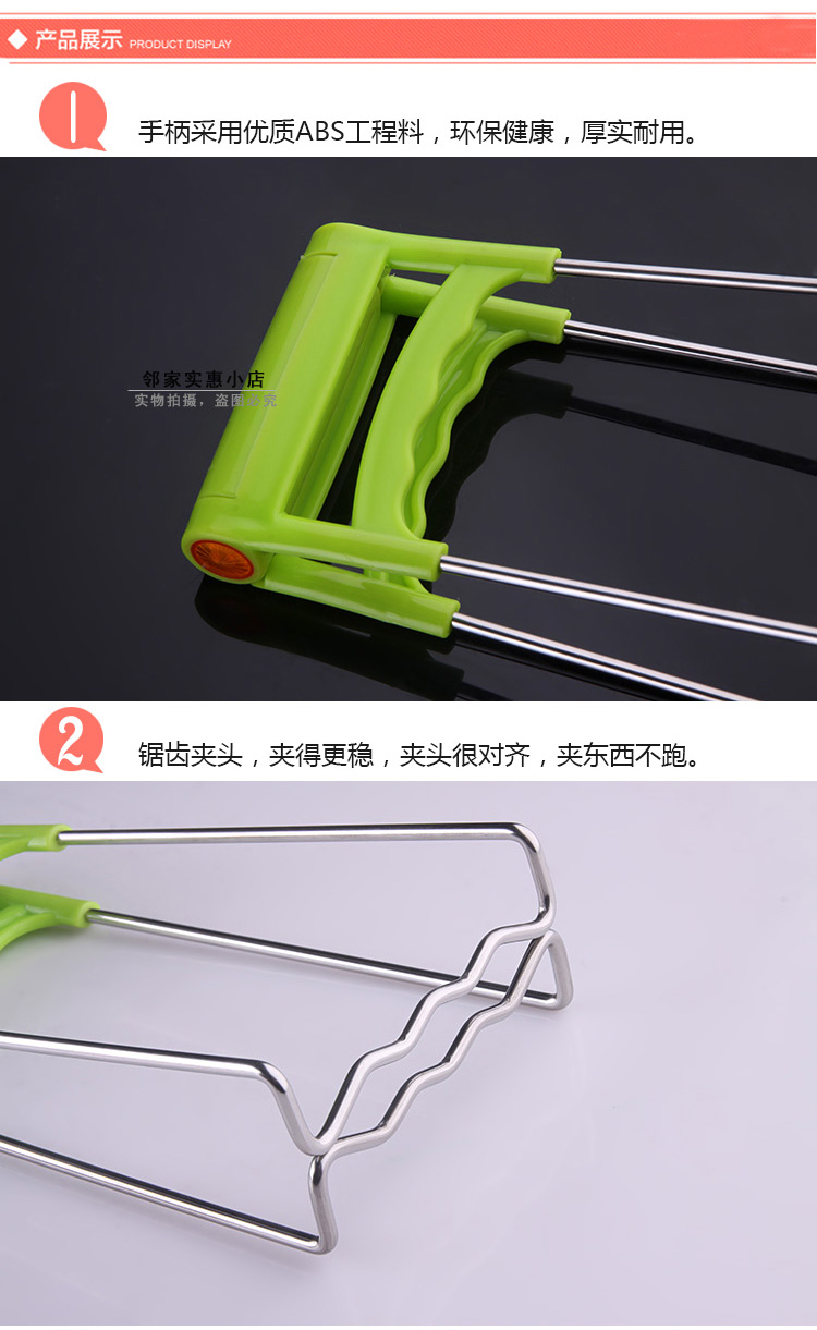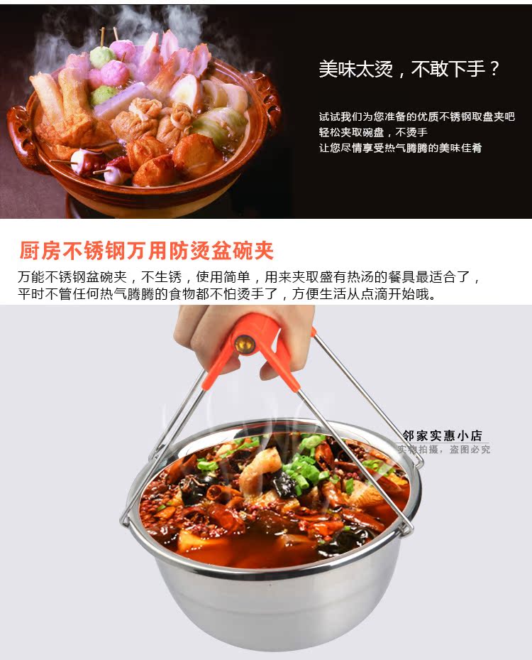 不銹鋼多用取碗夾 防燙碗碟夾提盤夾 夾盤子砂鍋夾 提碗器取盤夾 萬能不銹鋼盆碗夾,不生銹,使用簡潔,用來夾熱湯的食物最合適了,平時不管任何熱氣騰騰的實物都不用怕燙手了,方便生活從點滴開始哦。碗盤輕松夾住,不燙手,夾頭角度大,碗盤夾取方便,操作靈活。夾盤子或者碗,都輕松應對。手柄采用優質ABS工程料,環保健康,厚實耐用。 不銹鋼用品日常保養: 1.第一次使用時需要用食用醋或中性清潔劑去除制造中殘留的機油、焊接塵以及包裝搬運中接觸商品后留下的印跡等。 2.切勿用鋼絲球等硬質東西擦洗,使用后也可使用溫水兌醋或清潔劑清洗并擦凈水漬,這樣能保持產品的光澤及壽命。 3.如果是鍋具注意定期清洗鍋身外表面,以免產生積垢,影響熱效能。產品長時間不用請不要存放食物和水。鍋具本身不會變黃或變黑,但如果加熱過高或鍋體外壁粘有油漬或調味料,加熱可能會變黃、變黑,請使用不銹鋼專用清潔劑或等清洗即可,令鍋身光亮如新。 |