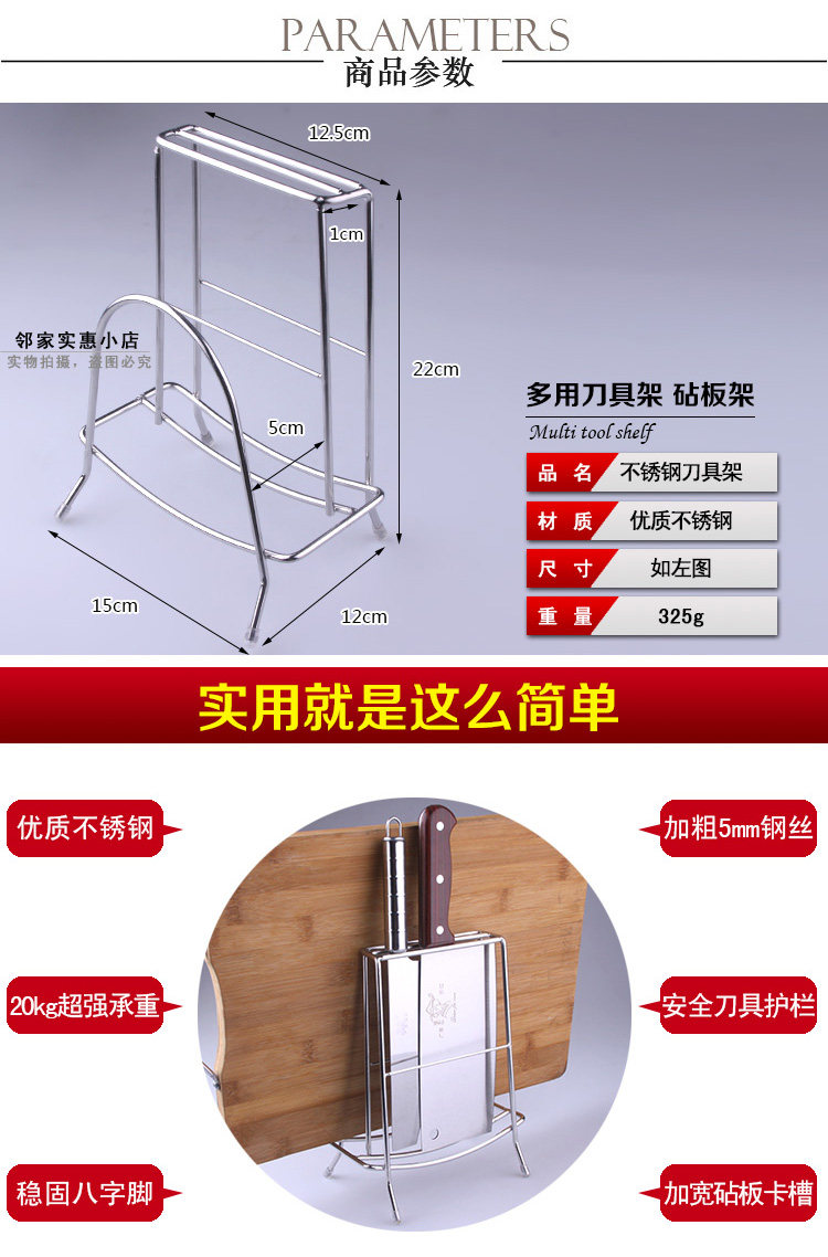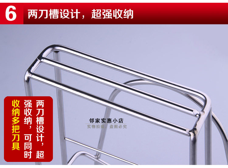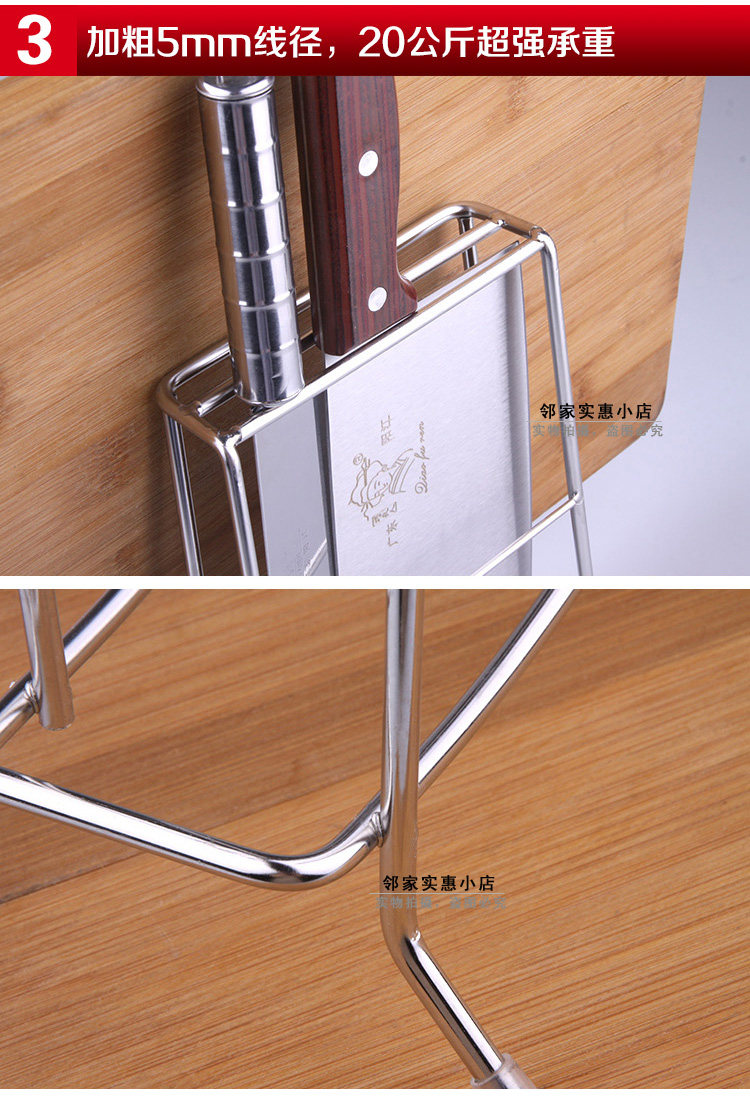 本款刀具架采用優質不銹鋼,防止生銹;加粗5MM鋼圈,20公斤超強承重。八字腳設計,前后不顛倒;更有防滑腳墊設計,超強防滑效果,而且更呵護臺面。多功能應用,刀具,鍋蓋,砧板都可收納,絕對是廚房收納的好幫手,超省空間。