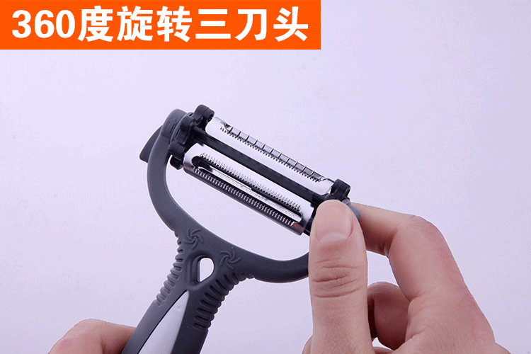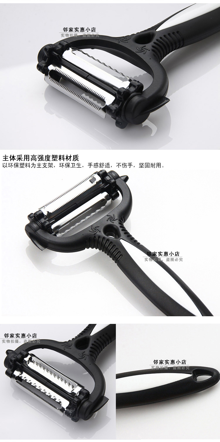 旋轉多功能削皮刀 不銹鋼水果刨 削皮器 刨絲器 切片 開橙 三面刀頭 360度可旋轉三面刀頭,三種可旋轉不同的削皮刀,使用起來刨削自如,只需要將頭部輕輕旋轉即可使用,超強耐用,居家必備。適合各種水果,蔬菜的削皮、刨絲、切片,開橙子也行哦!刀片采用優質不銹鋼材質,具有高度抗腐蝕性,韌性十足,經久耐用。 360度可旋轉三面刀頭 1.刨絲刀片 不銹鋼鋒利切絲刀片,切絲又快又均勻!做出來的菜口感更佳!再也不用擔心切土豆絲,蘿卜絲了。 2.削皮刀片 不銹鋼鋸齒形刀片,香瓜,蘋果,黃瓜,梨子等果蔬皮一樣好削。 3.削片刀片 不銹鋼鋒利刀片,切片又薄又好,切黃瓜片美容很方便。 4.開橙器 采用尖圓頭設計,可剝開橙子,桔子等水果 刀片采用優質不銹鋼材質 采用優質不銹鋼材質。具有高度抗腐蝕性,韌性十足,經久耐用。 主體采用高強度塑料材質 以環保塑料為主支架,環保衛生,手感舒適,不傷手,堅固耐用。 |