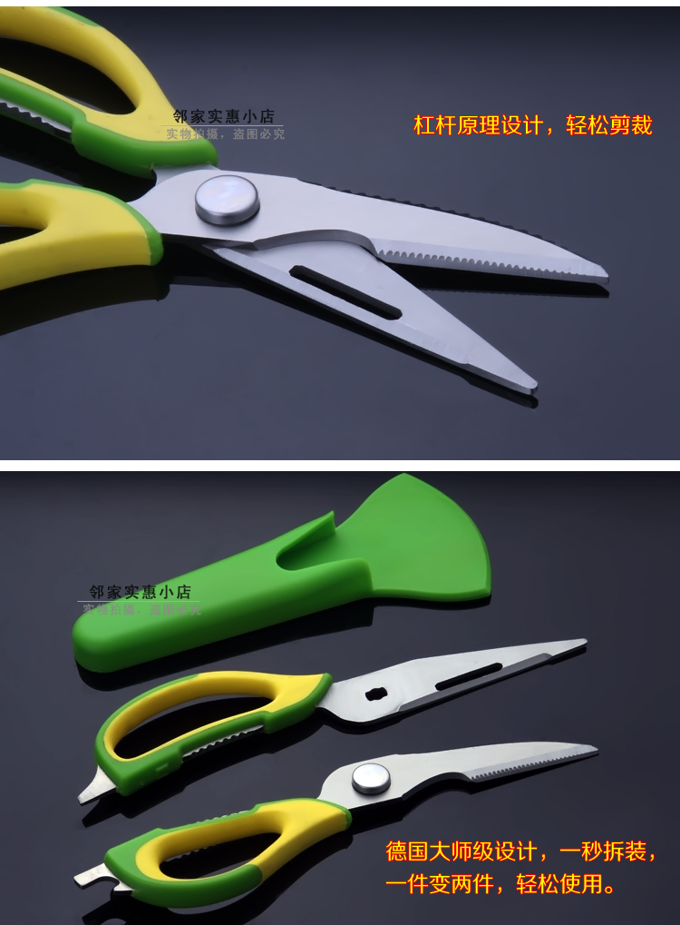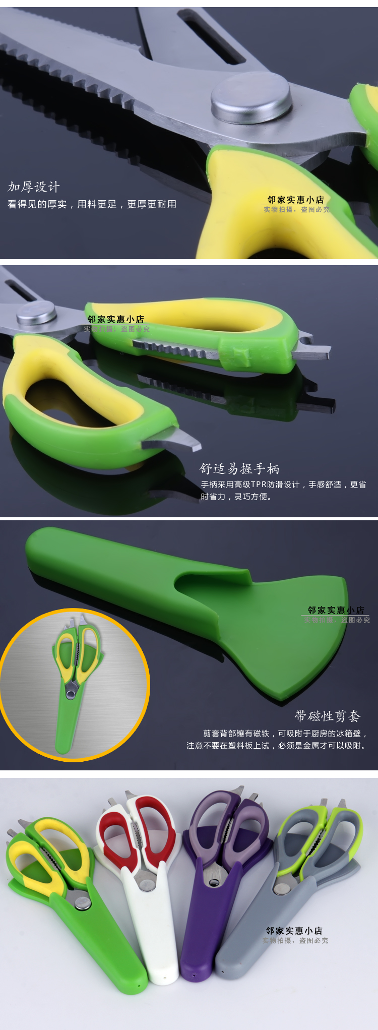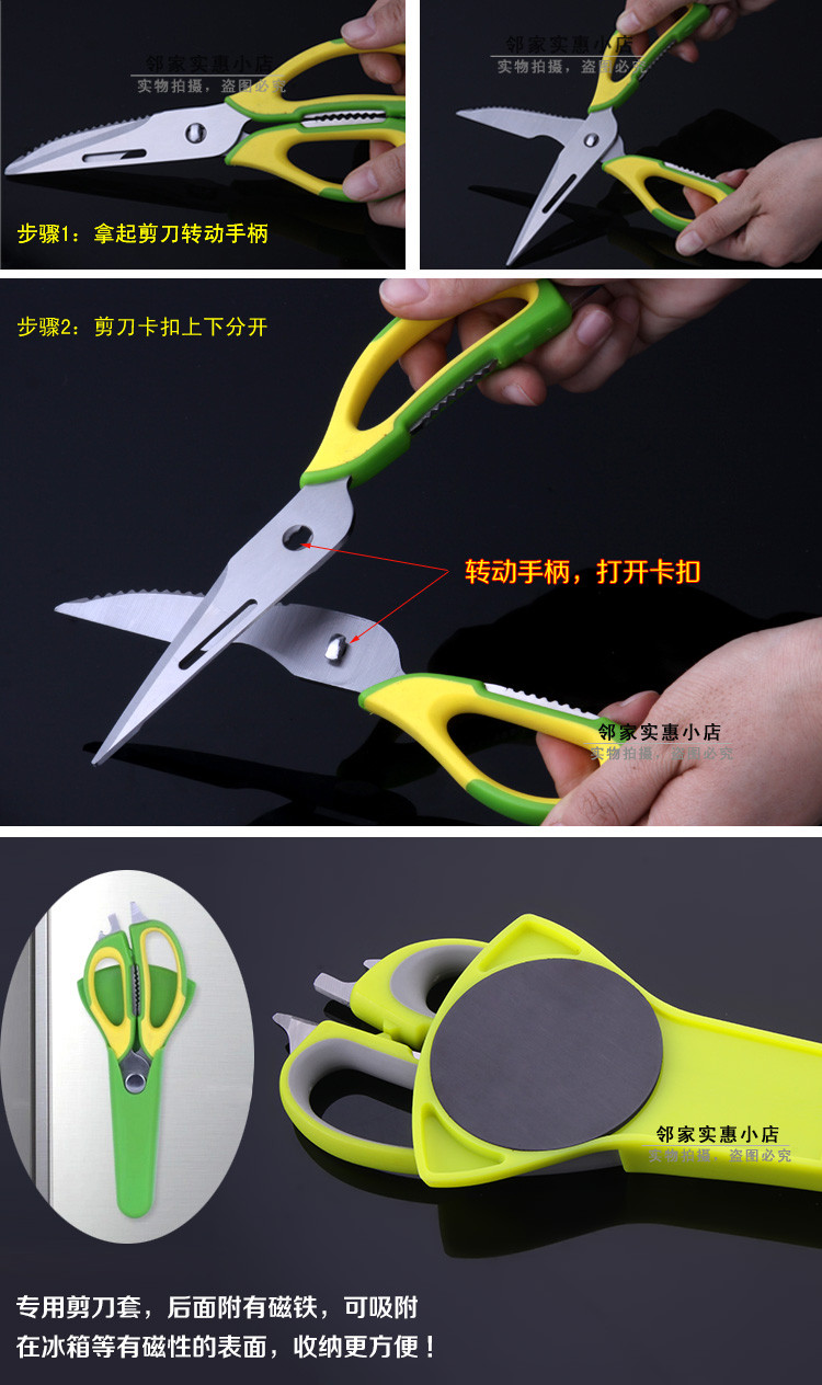 不銹鋼多功能冰箱剪刀 家用廚房剪刀 雞骨剪食物剪魚鱗刮 可拆卸 一剪多用,各種食材輕松搞定,料理簡單不費力,美觀又實用的器材,家中必不可少的神器,廚房好幫手!萬能剪刀 非常實用剪紙,剪肉菜等食物、開瓶罐、開堅果殼、刮魚鱗、削皮、切蔬菜等 ! 配有專用剪刀套,背后附有磁性,可粘貼吸附在冰箱表面。用時好找,不用時好收納。 剪刀使用: 1.接觸酸堿鹽類物質后應及時清洗擦干 2.切勿空剪以免無效磨損剪齒,刃部請勿隨意敲打跌碰,不要自行拆卸,用后在齒形刃口、剪軸處涂以薄機油存放 3.剪柄勿靠近高溫 4.兒童應在大人監護下使用 敬告: 銳利刀鋒,小心操作。 |