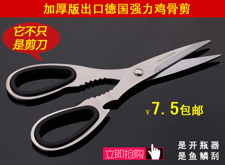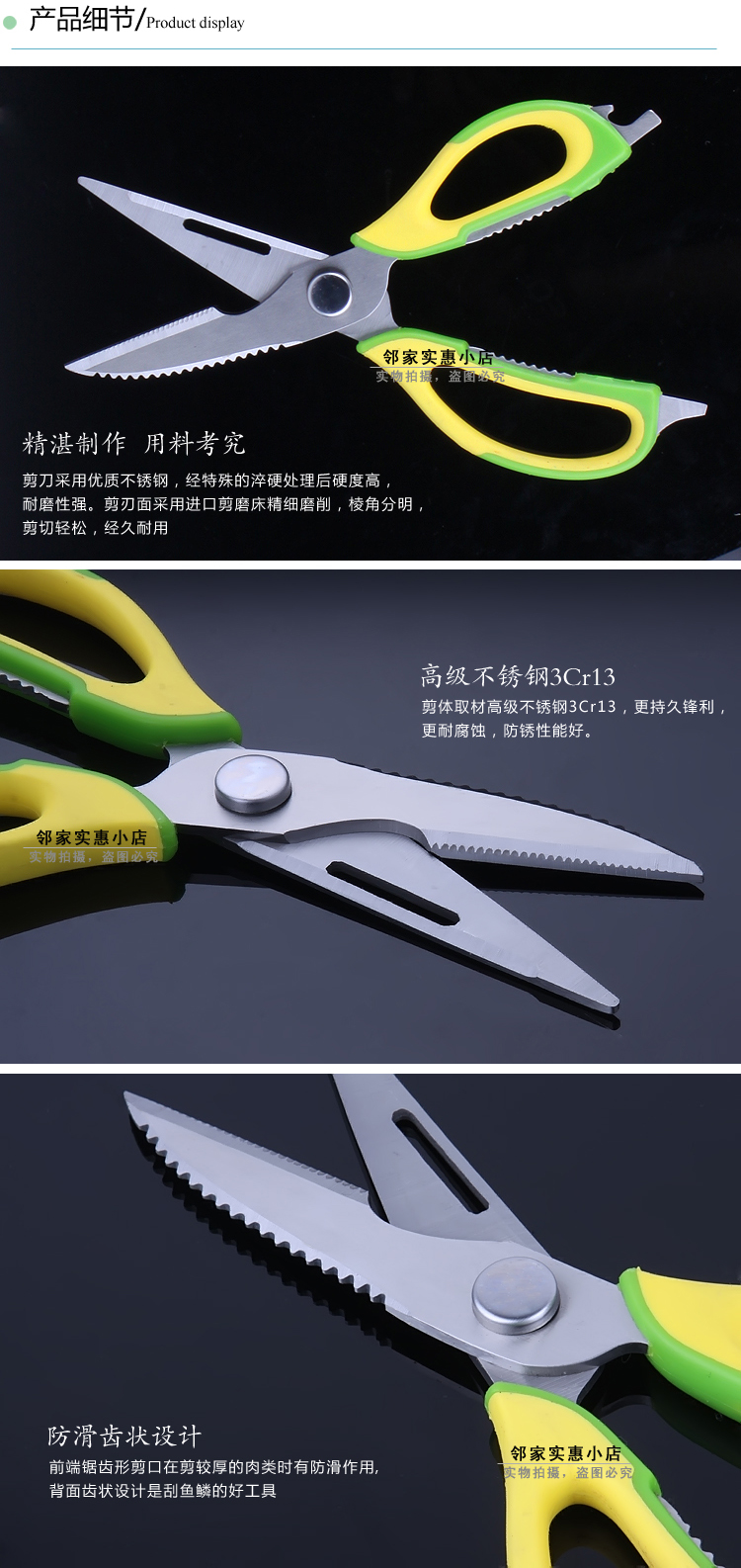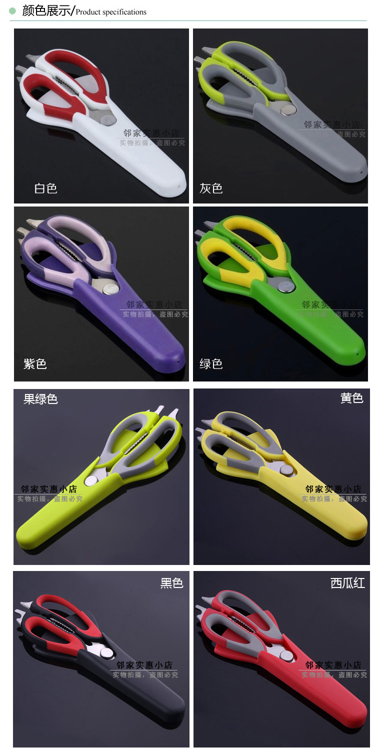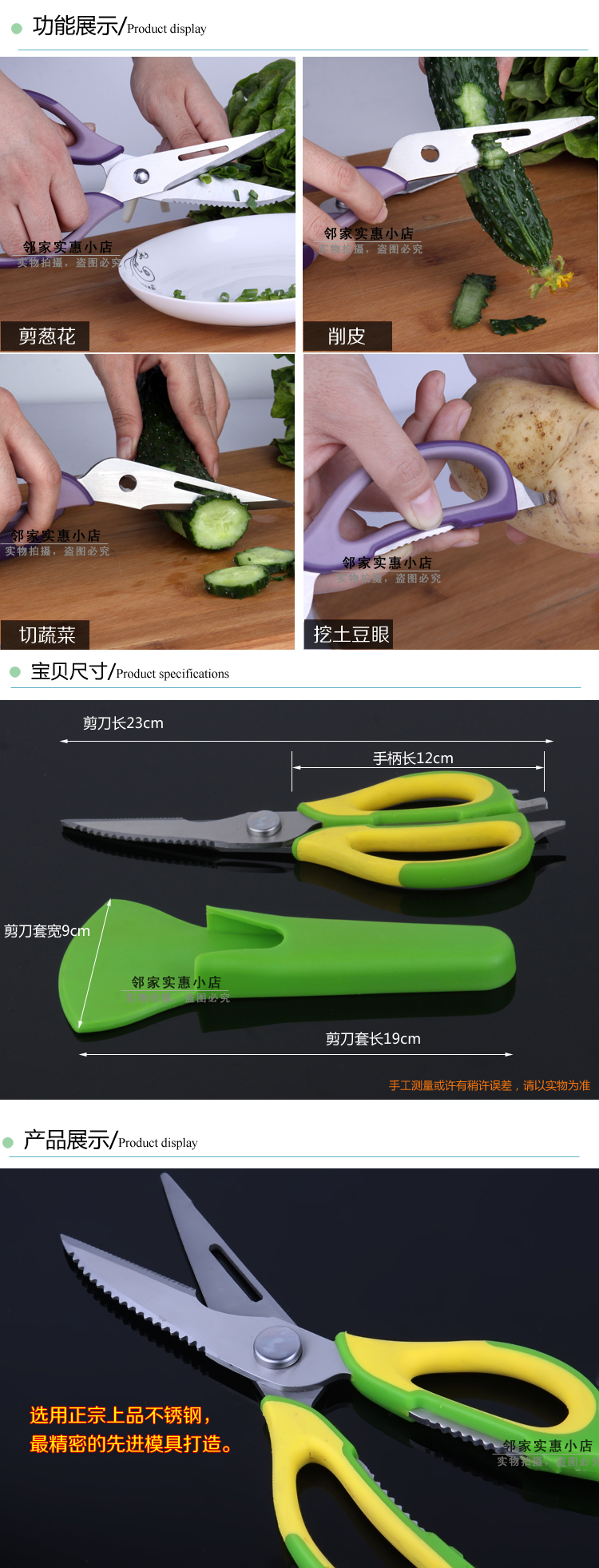 不銹鋼多功能冰箱剪刀 家用廚房剪刀 雞骨剪食物剪魚鱗刮 可拆卸 一剪多用,各種食材輕松搞定,料理簡單不費力,美觀又實用的器材,家中必不可少的神器,廚房好幫手!萬能剪刀 非常實用剪紙,剪肉菜等食物、開瓶罐、開堅果殼、刮魚鱗、削皮、切蔬菜等 ! 配有專用剪刀套,背后附有磁性,可粘貼吸附在冰箱表面。用時好找,不用時好收納。 剪刀使用: 1.接觸酸堿鹽類物質后應及時清洗擦干 2.切勿空剪以免無效磨損剪齒,刃部請勿隨意敲打跌碰,不要自行拆卸,用后在齒形刃口、剪軸處涂以薄機油存放 3.剪柄勿靠近高溫 4.兒童應在大人監護下使用 敬告: 銳利刀鋒,小心操作。 |