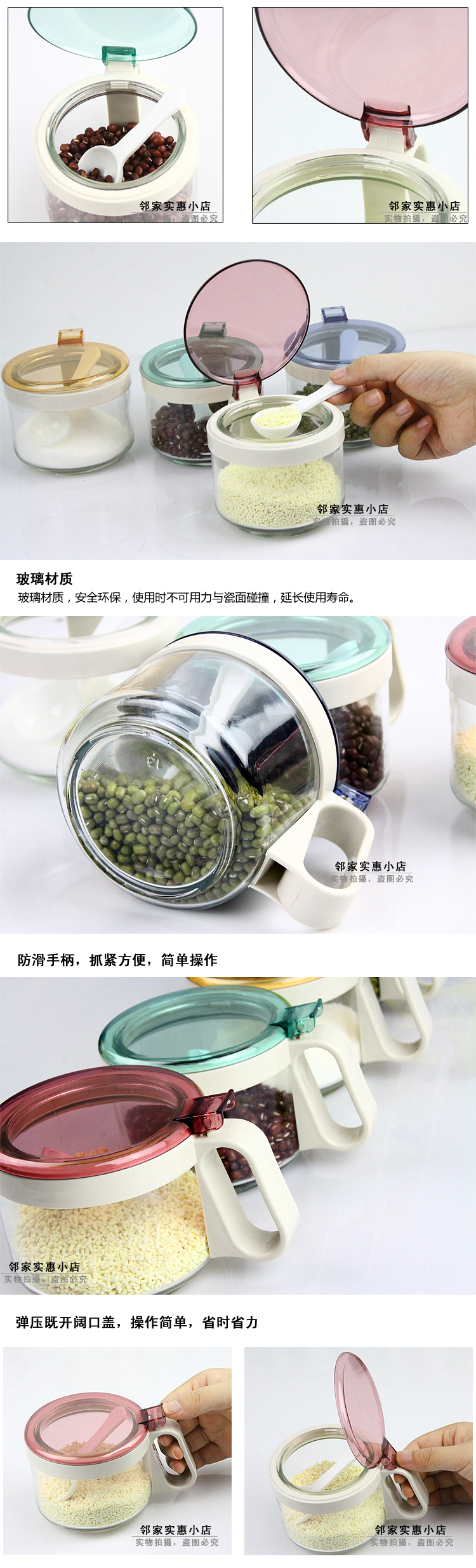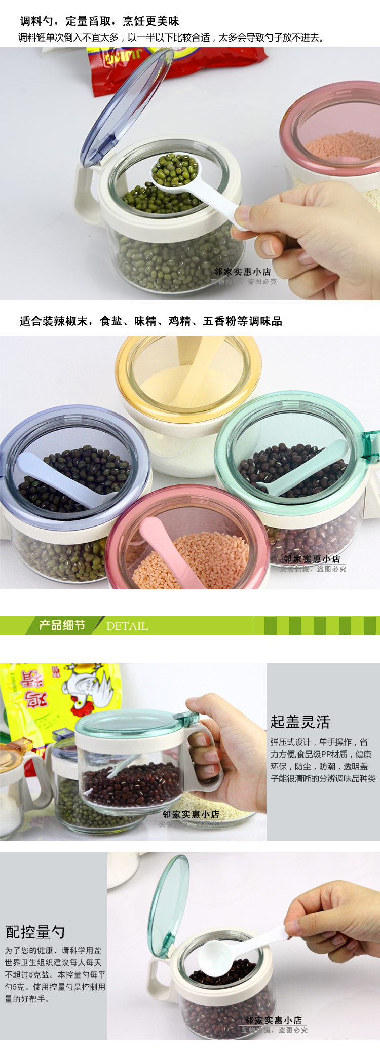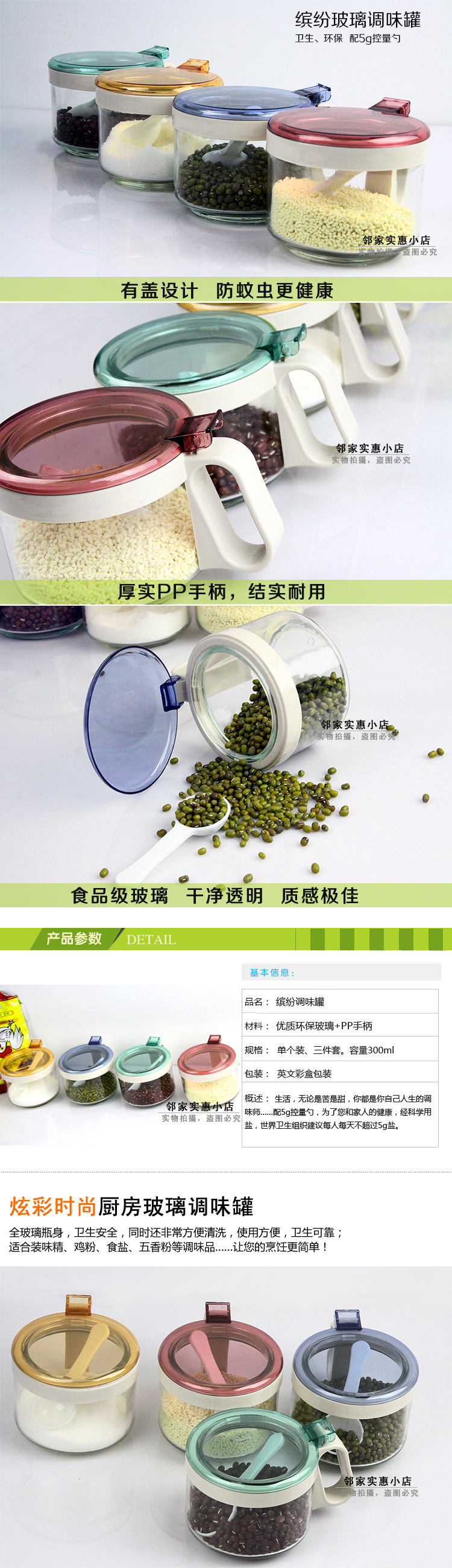 繽紛玻璃調味罐 調味瓶 時尚玻璃調味盒 調料盒罐 鹽罐 帶控量勺 炫彩時尚廚房玻璃調味罐,全玻璃瓶身,衛生安全,同時還非常方便清洗,使用方便,衛生可靠;適合裝味精、雞粉、食鹽、五香粉等調味品……讓您的烹飪更簡單!衛生、環保 配5g控量勺,定量舀取,烹飪更美味。彈壓既開闊口蓋,操作簡單,省時省力 注意事項: 1.瓶身為玻璃,請勿與其它硬物碰撞,小心輕放。 2.勿放置于爐灶旁,以免瓶身受熱破裂。 3.密封罐在清洗過程中,不要用鋼絲球類等粗糙清潔刷,以免刮花,影響美觀。 |