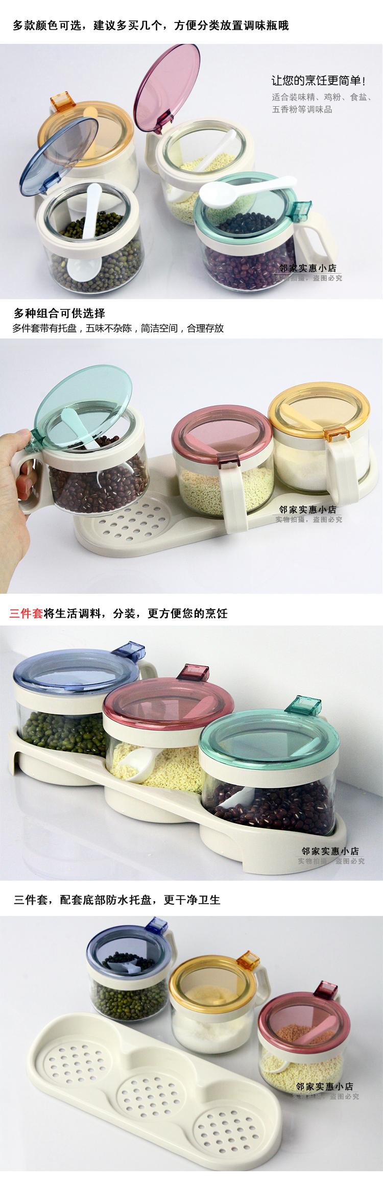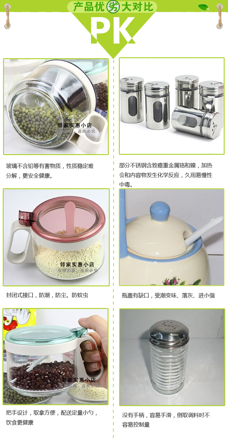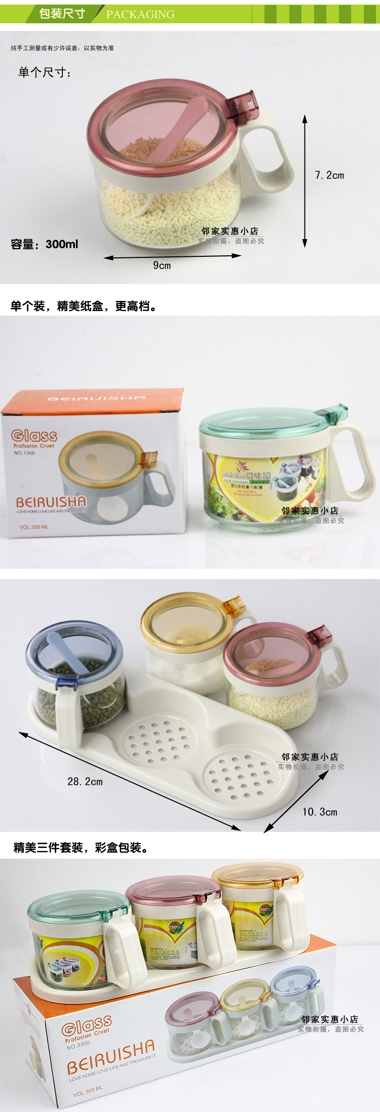 繽紛玻璃調味罐 調味瓶 時尚玻璃調味盒 調料盒罐 鹽罐 帶控量勺 炫彩時尚廚房玻璃調味罐,全玻璃瓶身,衛生安全,同時還非常方便清洗,使用方便,衛生可靠;適合裝味精、雞粉、食鹽、五香粉等調味品……讓您的烹飪更簡單!衛生、環保 配5g控量勺,定量舀取,烹飪更美味。彈壓既開闊口蓋,操作簡單,省時省力 注意事項: 1.瓶身為玻璃,請勿與其它硬物碰撞,小心輕放。 2.勿放置于爐灶旁,以免瓶身受熱破裂。 3.密封罐在清洗過程中,不要用鋼絲球類等粗糙清潔刷,以免刮花,影響美觀。 |