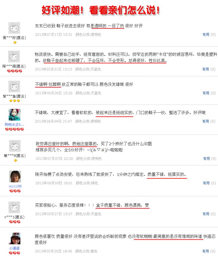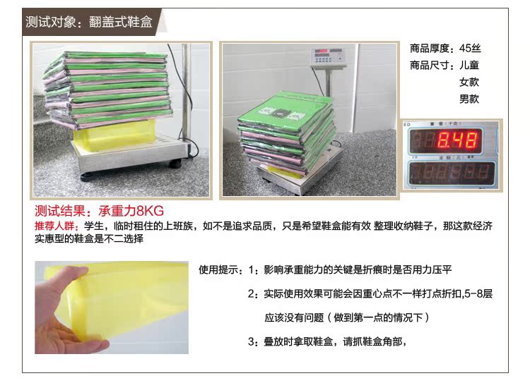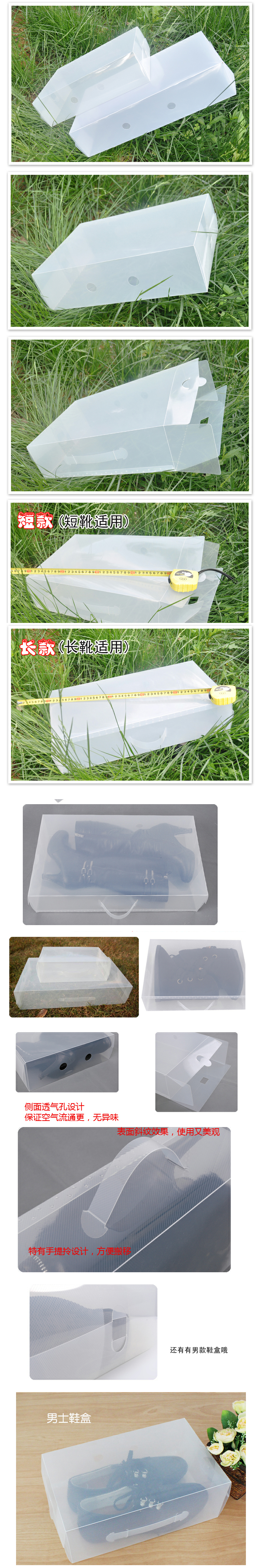 本店有多款寶貝,親可在本店買了寶貝后,再挑一些其他商品,一起發出哦,3公斤內不需要再另外支付了,買到就真的賺到啦~~, 本店的多款寶貝,真的是虧錢的,親,收到后別忘了給好評、全五分哦 ![]() ------------------------------------------------------------------------------------------------------------------------------------------- 鞋盒很實用、很好用的哦,為什么有小部分客戶會說軟軟的? 因為此產品是塑料制品,在快遞的運輸中會偶爾會有壓到包裹的情況,所以如果收到鞋盒,壓到的折痕,是正常的,不影響正常使用的哦。這種折疊鞋盒,每個折疊的地方,一定要充分用力折好,才會非常結實,否則裝起來的鞋盒會軟軟的哦~ 【尺寸】:普通款:28×18×10cm 男士鞋盒: 34x20x12cm 短靴款: 40x28x11cm 長靴款:52x30x12cm