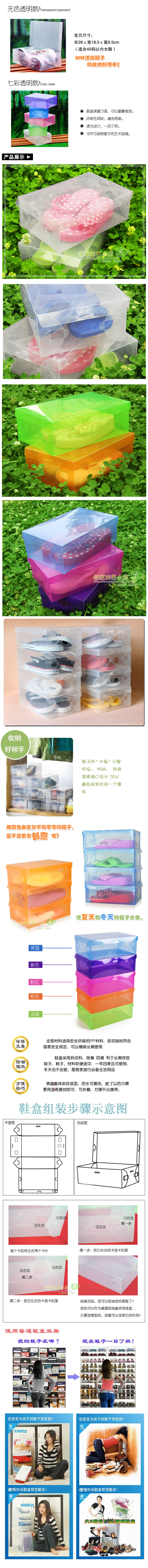1.可折合設計,方便儲存;低存放鞋子之空間。 2.透明鞋盒具有堅實,牢固,韌性的特點.不怕受潮、不怕變形、攜帶方便, 3.儲鞋盒可以很方便地垂直疊放排列,讓鞋柜更美觀整潔; 4。里面的鞋子一目了然,讓你再也不用為找鞋子煩惱。 5。讓你不穿的鞋子始終保持清潔! 純進價!由于本店主營改高檔不銹鋼餐具廚具系列,其他分類商品全部進價或虧本賣了!有喜歡的,抓緊來淘,賣完就沒了。質量保證! 真正0利潤!不參加店內活動!
