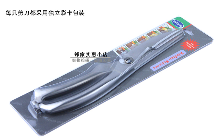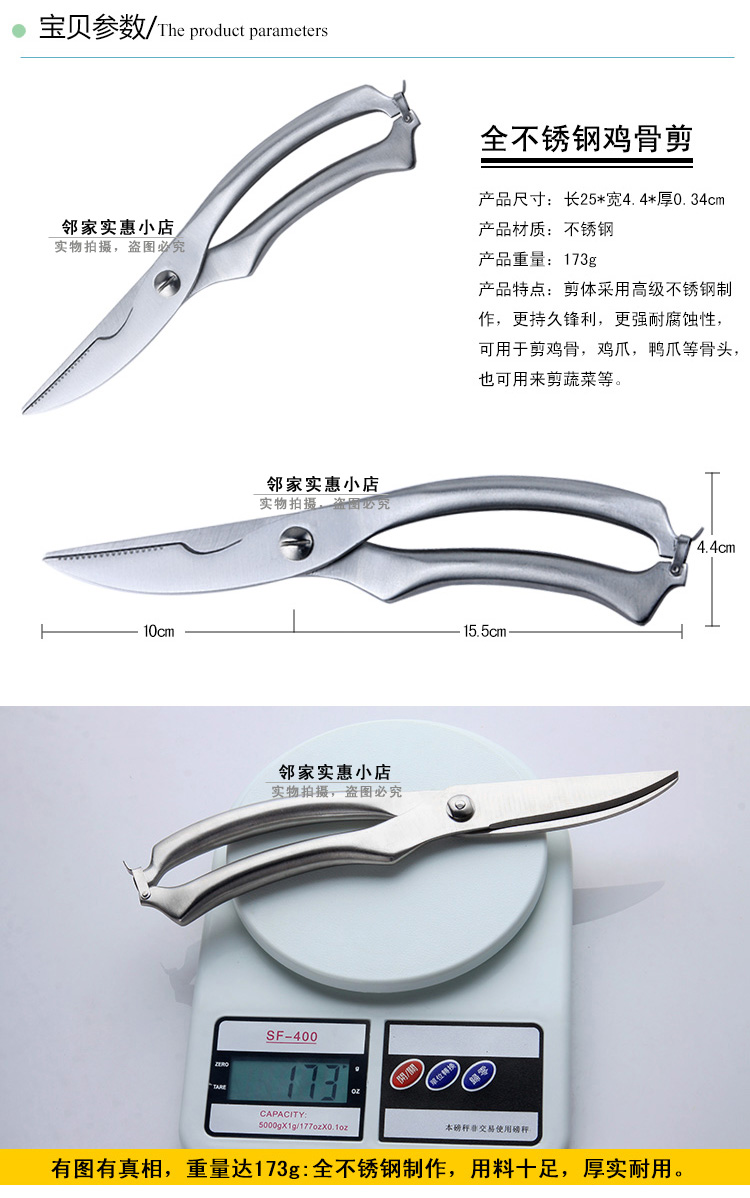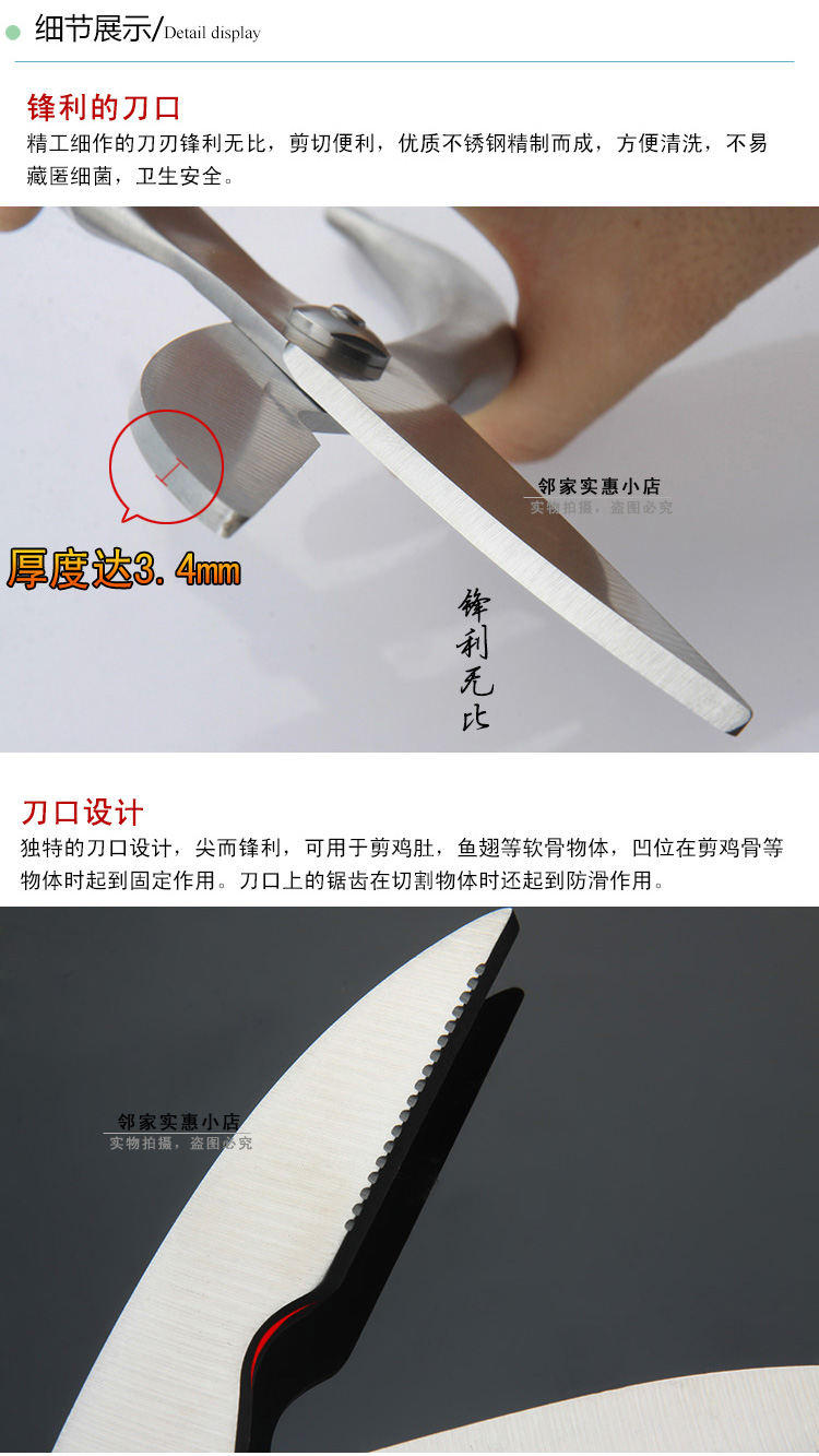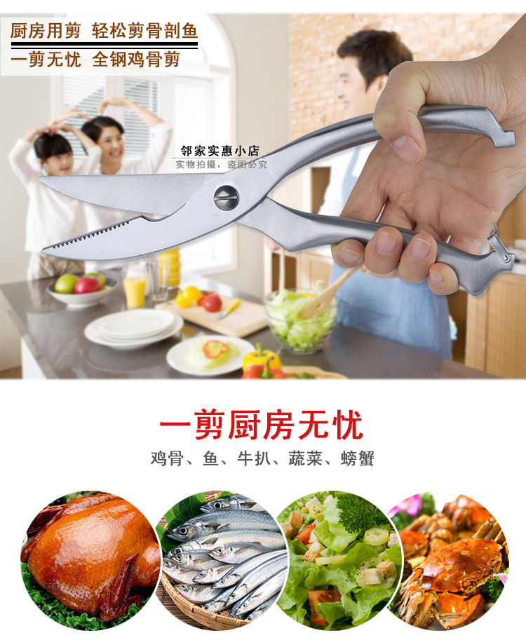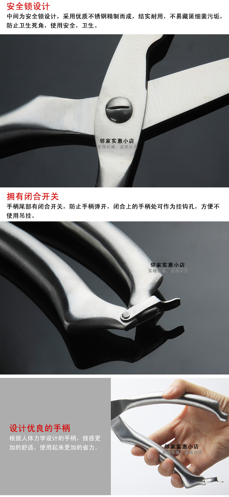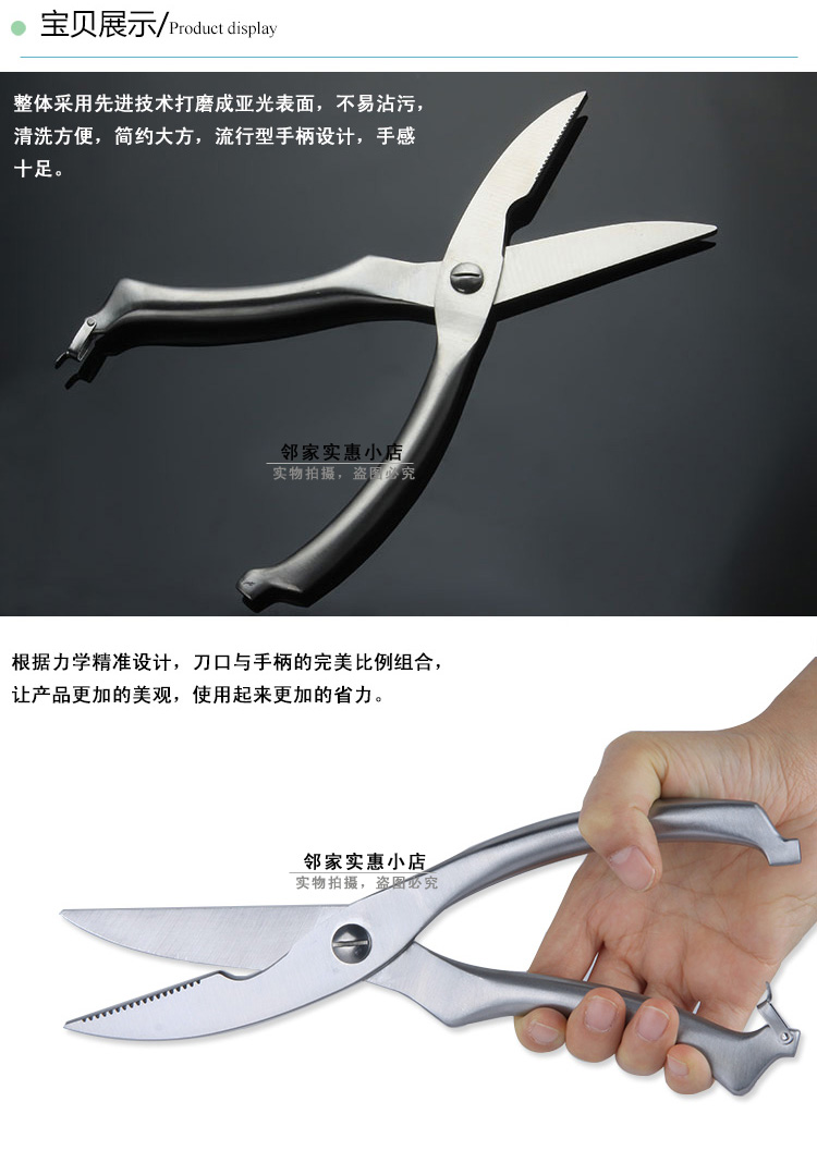 高檔全不銹鋼強力廚房剪刀 出口德國強力雞骨剪 家用多用食物剪 剪體采用高級不銹鋼制作,更持久鋒利,更強耐腐蝕性,可用于剪雞骨,雞爪,鴨爪等骨頭,也可用來剪蔬菜等。 產品特色 1.整體采用先進技術打磨成亞光表面,不易沾污,清洗方便,簡約大方,流行型手柄設計,手感十足。 2.根據力學精準設計,刀口與手柄的完美比例組合,讓產品更加的美觀,使用起來更加的省力。 3.刀口設計:獨特的刀口設計,尖而鋒利,可用于剪雞肚,魚翅等軟骨物體,凹位在剪雞骨等物體時起到固定作用。刀口上的鋸齒在切割物體時還起到防滑作用。 4.安全鎖設計:中間為安全鎖設計,采用優質不銹鋼精制而成,結實耐用,不易藏匿細菌污垢,防止衛生死角,使用安全,衛生。 5.鋒利的刀口:精工細作的刀刃鋒利無比,剪切便利,優質不銹鋼精制而成,方便清洗,不易藏匿細菌,衛生安全。 6.擁有閉合開關:手柄尾部有閉合開關,防止手柄彈開,閉合上的手柄處可作為掛鉤孔,方便不使用吊掛。 7.設計優良的手柄:根據人體力學設計的手柄,握感更加的舒適,使用起來更加的省力。 刀具保養小貼士: 1.每次用完刀具后,必須要洗干凈后擦干,并且抹上熟的食用油后,將其放在通風干燥處,這樣可以有效的防止刀具生銹。同時避免其接觸到一氧化碳,否則會使刀具產生黃斑。 2.如果家里的菜刀或剪刀已經生銹的話,可以用地瓜擦拭的方法來解決。方法是:切幾片地瓜,然后用其在刀具上仔細的擦幾遍后,用抹布擦干凈即可。此外,還可以將生銹的菜刀放入到淘米水中浸泡3個小時,這樣也可以起到去銹的作用。 3.刀具用鈍了時,可以用水磨法解決。方法是:刀用鈍時,加水以15度-20度角在磨刀石上來回磨數下即可鋒利無比。 4.斬骨時宜用刀刃的根部接觸骨頭,垂直落刀。如果骨頭卡住刀刃時,不宜左右搖晃,拔出刀刃口。正確的方法是將骨頭與刀具一起舉起再砍,直至骨斷。否則,會造成刀刃端鋼成弧形缺口。 警告:刃口鋒利,請放置在小孩觸摸不到的安全地方。清潔時注意避讓刃口。 |