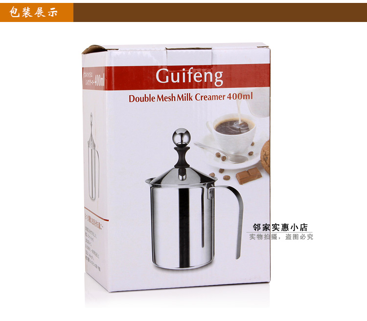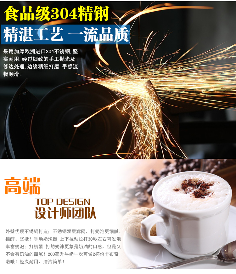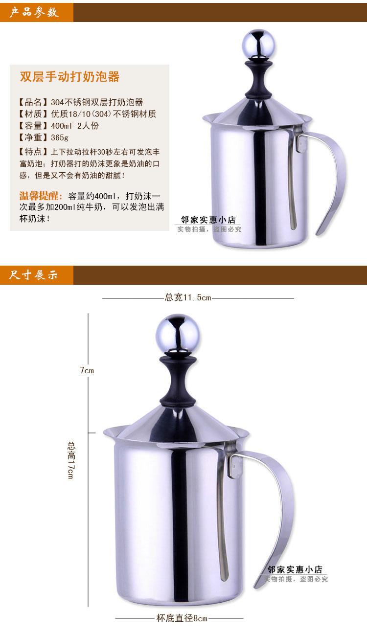 花式拿鐵/卡布奇諾咖啡必備! 加厚高檔304不銹鋼打造; 高檔304不銹鋼雙層細濾網,打奶泡更細膩,棉醇、堅挺! 手動奶泡器,上下拉動拉桿30秒左右可發泡,豐富奶泡; 打奶器 打的奶沫更象是奶油的口感,但是又不會有奶油的甜膩! 最大容量為400ml,打奶沫一次最多加200ml純牛奶,就可以發泡出杯奶沫哦! 【使用方法】: 倒入鮮牛奶拉動數下刮掉粗奶泡,然后在預先做好的咖啡上倒入奶泡、即成一杯香濃的卡布奇諾牛奶。 卡布其諾咖啡之制作法: Cappuccino卡布其諾----咖啡與牛奶的完美結合,給人一種很rich的感覺。做好這一杯咖啡,要準備好細膩的奶泡、作基底的Espresso咖啡,如果技術過硬的話在奶泡上拉花,會讓卡布其諾更有生命力。 下面就各個細節分別介紹: 一、奶泡的制作:用手動打奶泡器制作手工奶泡 1、將牛奶倒入奶泡壺中,份量不要超過奶泡壺的1/2,否則制作奶泡的時候牛奶會因為膨脹而溢出來。 2、將牛奶加熱到60度左右,但是不可以超過70度,否則牛奶中的蛋白質結構會被破壞。注意!蓋子與濾網不可以直接加熱。如制作冰奶泡則將牛奶冷卻至5度以下,當然,不要冰過頭而讓牛奶結冰了。 3、將蓋子與濾網蓋上,快速抽動濾網將空氣壓入牛奶中,抽動的時候不需要壓到底,因為是要將空氣打入牛奶中,所以只要在牛奶表面動作即可;次數也不需太多,輕輕地抽動三十下左右即可。 4、移開蓋子與濾網,用湯匙將表面粗大的奶泡刮掉,留下的就是綿密的熱冰奶泡。 二、拉花方式: 1、沖煮Espresso咖啡,建議直接將Espresso咖啡盛接在所需要的杯子中。接著打奶泡,完成后若是表面浮有較粗的奶泡請將其去除。 2、慢慢的將打好的奶泡倒入剛完成的Espresso中。當倒入的奶泡與Espresso已經充份混合時,表面會呈現濃稠狀,這時候便是開始拉花的時機通常此時杯子里已經半了。 3、拉花的開始動作便是左右晃動拿著拉花杯的手腕,重點在于穩定地讓手腕做水平的左右來回晃動。請注意,這個動作純粹只需要手腕的力量,不要整只手臂都跟著一起動。當晃動正確時,杯子中會開始呈現出白色的“之”字型奶泡痕跡。 4、逐漸往后移動拉花杯,并且縮小晃動的幅度,最后收杯時往前一帶順勢拉出一道細直線,畫出杯中葉子的梗作為結束。 |