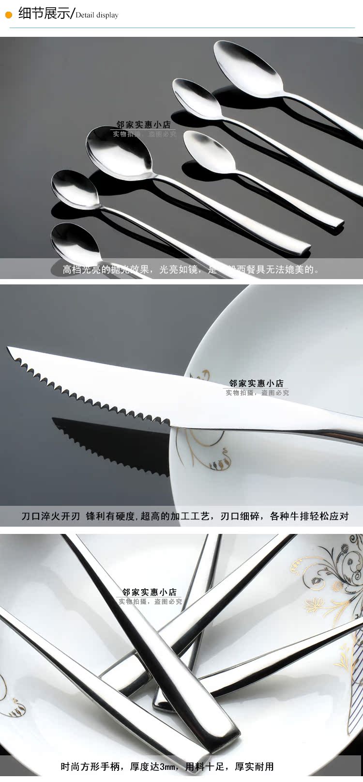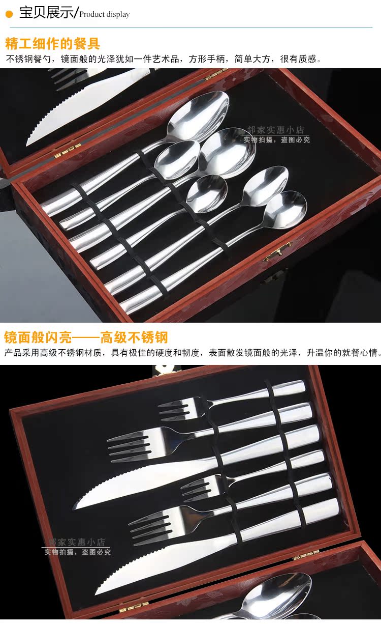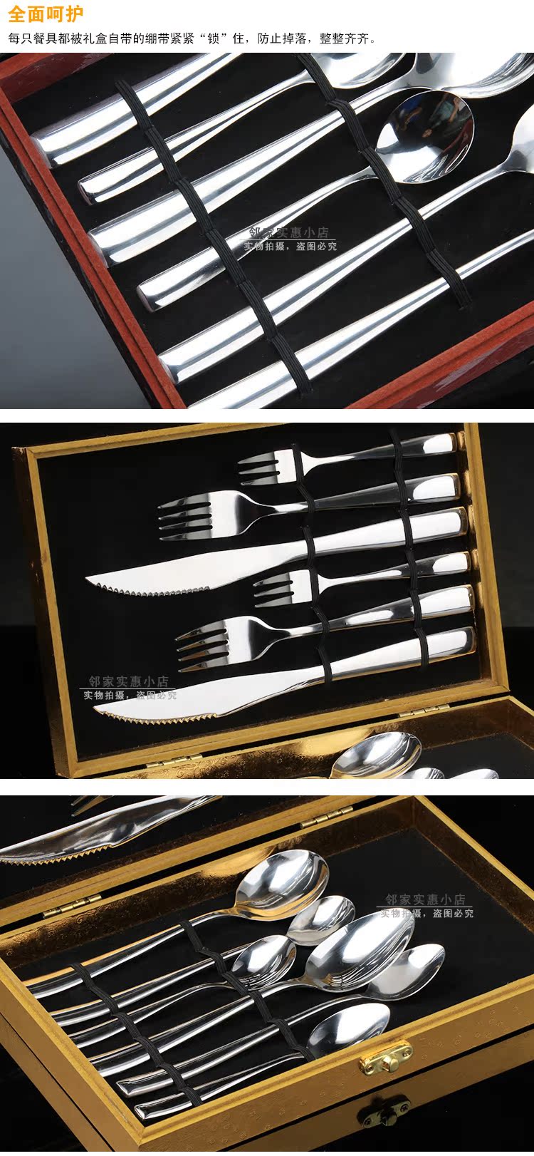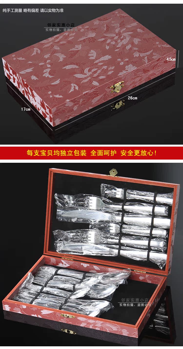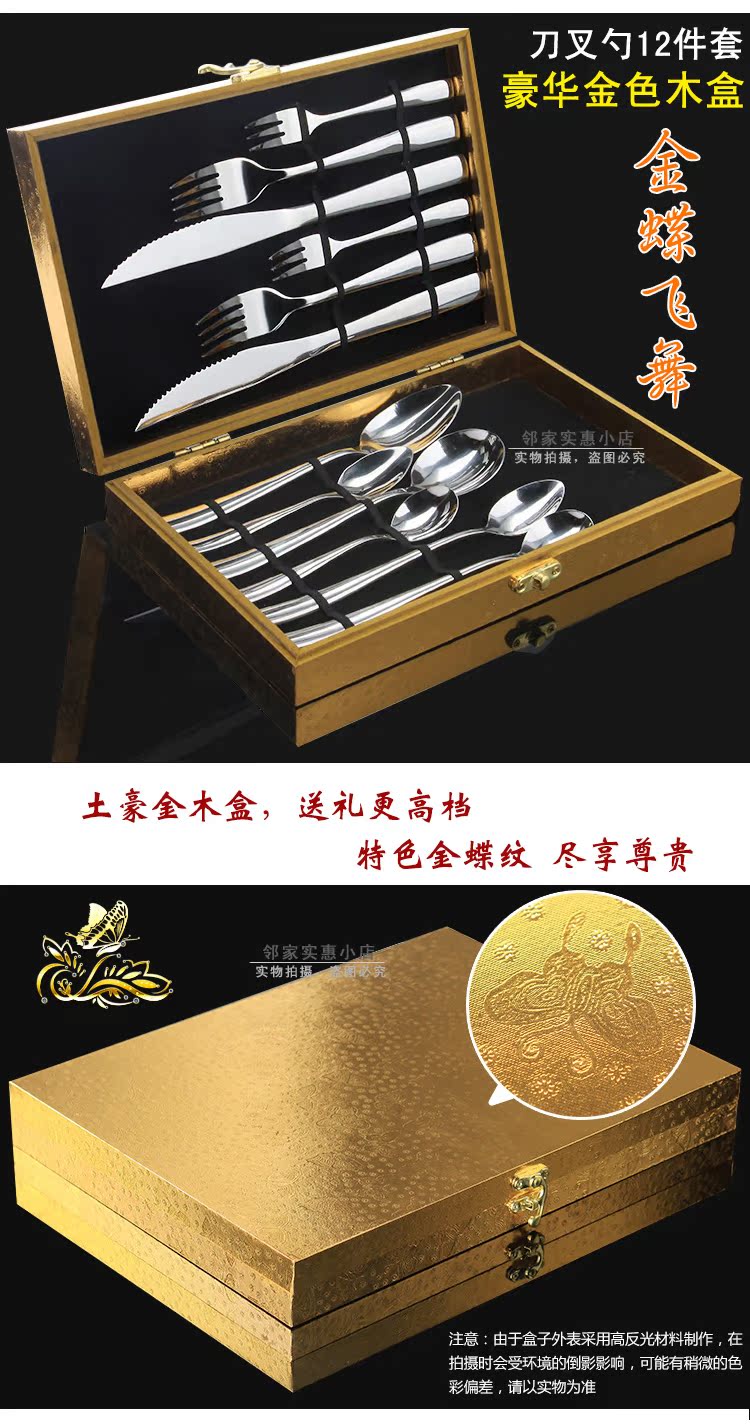 高檔不銹鋼西餐餐具12件套裝 不銹鋼牛排刀叉勺子 豪華版禮盒 不銹鋼刀叉勺12件套,豪華版禮盒套裝,酒紅牡丹/金蝶飛舞,l兩種款式選擇,高端大氣上檔次,是送禮的首選哦。餐具由優質不銹鋼精制而成,方形手柄非常厚實,質量非常優越。餐具表面采用先進的鏡面拋光工藝,帶來勝于其他金屬的光澤度。是浪漫西餐之首選哦! 不銹鋼用品日常保養: 1.第一次使用時需要用食用醋或中性清潔劑去除制造中殘留的機油、焊接塵以及包裝搬運中接觸商品后留下的印跡等。 2.切勿用鋼絲球等硬質東西擦洗,使用后也可使用溫水兌醋或清潔劑清洗并擦凈水漬,這樣能保持產品的光澤及壽命。 3.如果是鍋具注意定期清洗鍋身外表面,以免產生積垢,影響熱效能。產品長時間不用請不要存放食物和水。鍋具本身不會變黃或變黑,但如果加熱過高或鍋體外壁粘有油漬或調味料,加熱可能會變黃、變黑,請使用不銹鋼專用清潔劑或等清洗即可,令鍋身光亮如新。 |