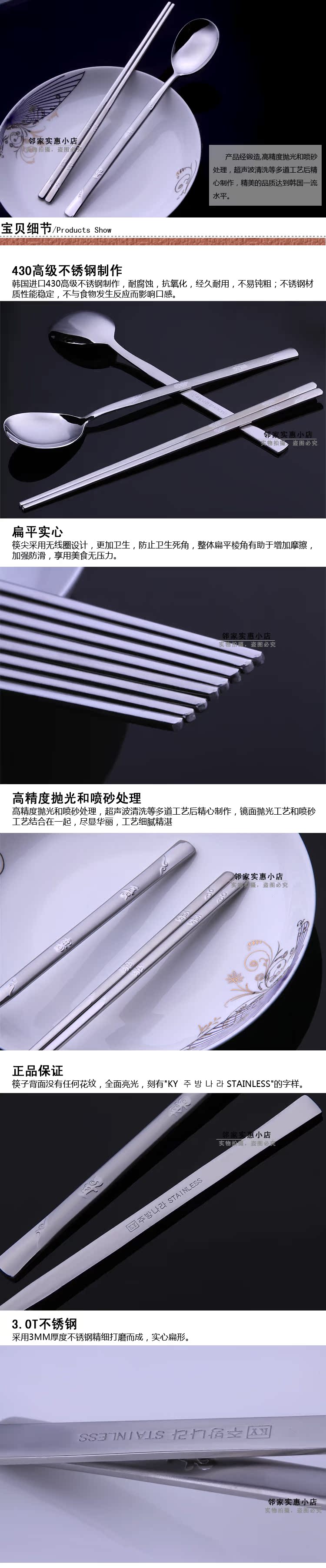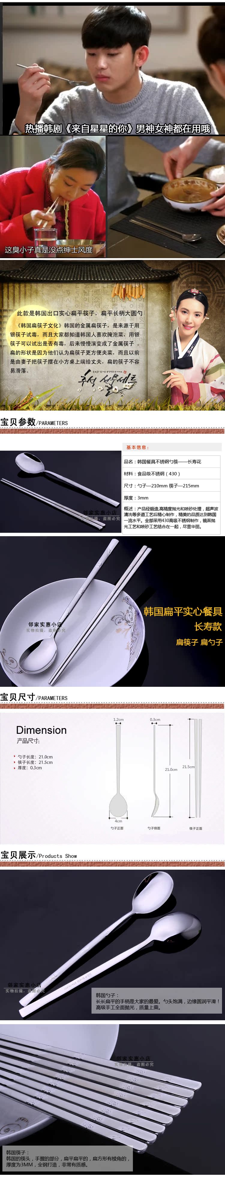 韓國不銹鋼長壽勺筷套裝 實心扁筷勺子 扁平筷子長柄勺 韓式餐具