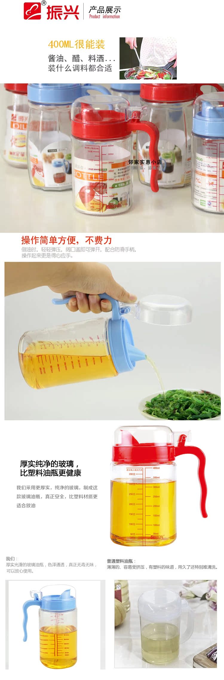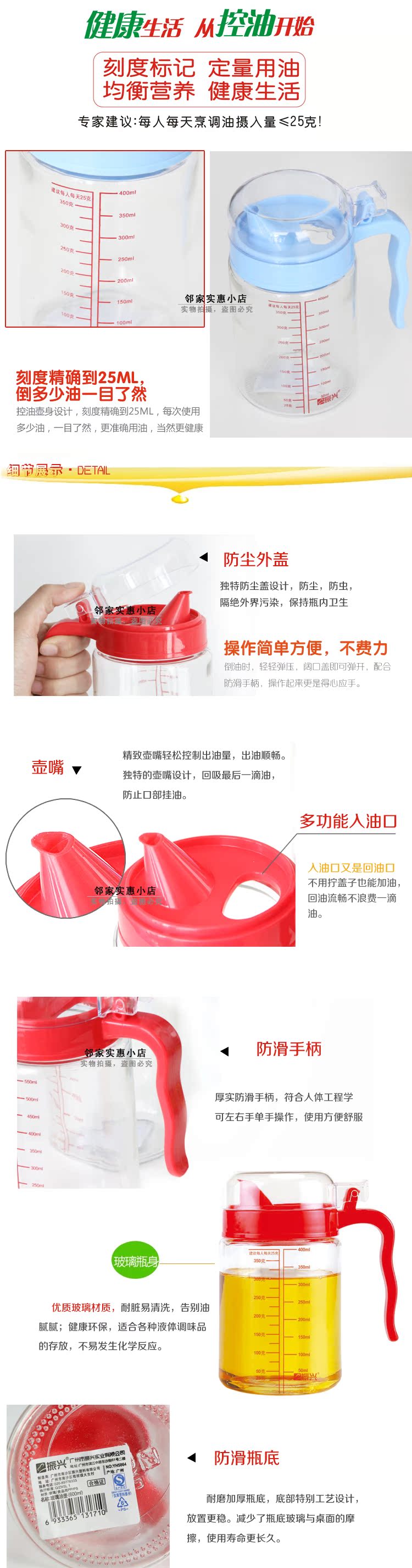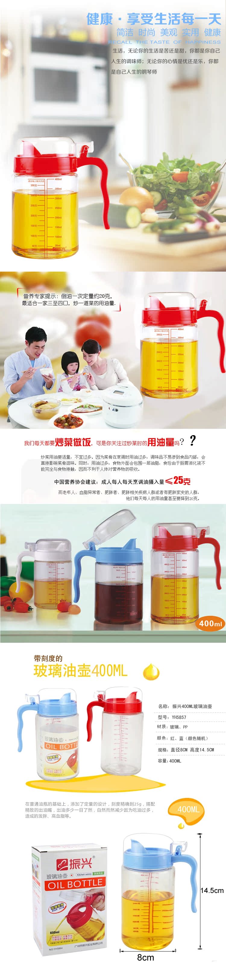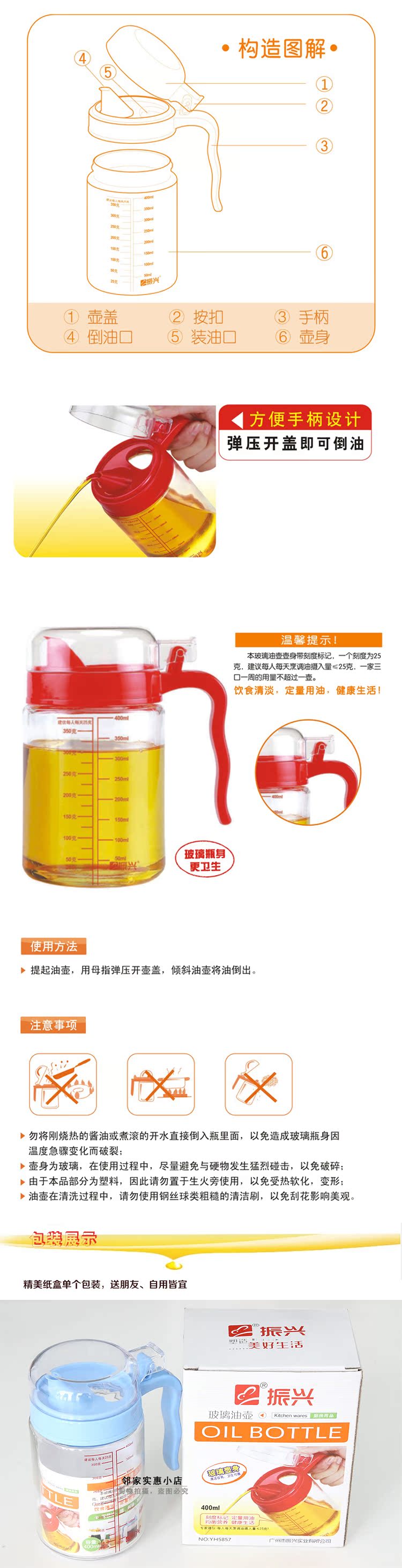 點點滴滴,健康升級。 健康用油亦有道!成人每天食用油攝取量不超過25ml為好。此款油壺在普通油瓶的基礎上,添加了定量設計,刻度精確到了25ml,搭配精制出油嘴,出油多少一目了然,自然而然少因吃油過多造成的發胖、高血脂等。 炒菜用油要適量,不宜過多。因為菜肴在烹調時用友過多,調味品不易滲到視頻內部,會直接影響菜肴滋味。同時,用油過多,食物外面回包圍一層油脂,食用后由于腸胃消化液不能完全與食物接觸,因為不利于人體營養物吸收。中國營養協會建議:成人每人每天烹調油攝入量?25克 產品特色 此款油壺在普通油瓶的基礎上,添加了定量設計,刻度精確到了25ml,搭配精制出油嘴,出油多少一目了然,自然而然少因吃油過多造成的發胖、高血脂等。玻璃壺身,容易清洗,使用方便衛生可靠;彈壓式開口,配合防滑手柄,操作簡單,省時省力;獨特壺嘴,倒油準確不浪費。 振興玻璃油壺400ml 廚房防漏刻度醬油壺 健康油瓶調味瓶醋瓶5857 產品型號:YH5857 產品名稱:玻璃油瓶400ML 產品材質:玻璃、PP 產品顏色:紅//藍 振興玻璃油壺600ml 廚房防漏刻度醬油壺 健康油瓶調味瓶醋瓶5864注意事項: 1. 瓶身為玻璃,請勿與其它硬物碰撞,小心輕放。 2.勿放置于爐灶旁,以免瓶身受熱破裂。 3.在清洗過程中,不要用鋼絲球類等粗糙清潔刷,以免刮花,影響美觀。 各位親本店有多款寶貝,我們每件要虧包裝人工6左右,親可在本店買了寶貝后,再挑一些其他商品,3公斤內一起發出哦,不需要再另外支付了,買到就真的賺到啦~~, 本店的多款寶貝,真的是虧錢的,親,收到后別忘了給好評、全五分哦 ![]() |