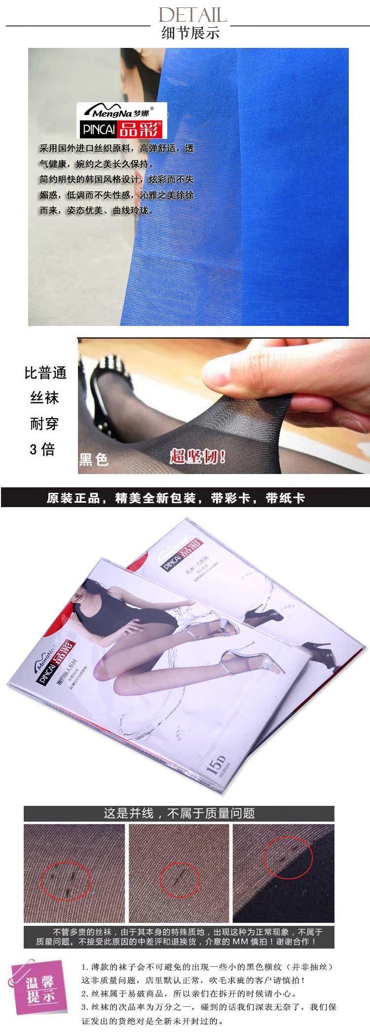 本店有多款寶貝,親可在本店買了寶貝后,再挑一些其他商品,一起發出哦,3公斤內不需要再另外支付了,買到就真的賺到啦~~, 本店的多款寶貝,真的是虧錢的,親,收到后別忘了給好評、全五分哦 ![]() 本店只發匯通快遞、郵政小包哦, 本店所有商品的地區:、、、、、、、、、、、、、、、。其他省市地區,因運輸成本較高,拍下需要加哦,謝謝您的理解。 虧本2件!夢娜正品!本款絲襪采用高檔絲織原料,德國編織工藝,色澤透明,薄如蟬翼,高彈耐穿;特有的萃取百合精華,清新超爽,可防止皮膚角質,舒感爽滑,讓皮膚自由呼吸,塑腿美膚。