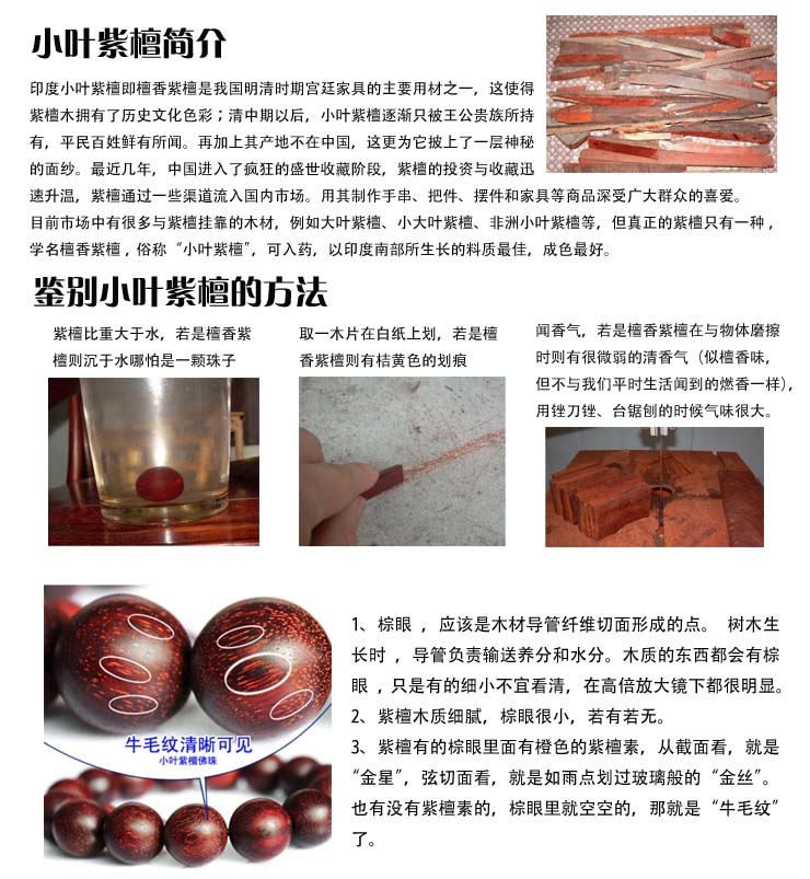20MM的珠子做的成品 紫檀簡介: 紫檀是世界上最名貴的木種之一,屬碟形華科。由于其生長速度緩慢約50年方能長1厘米,800年以上才能成材,在這漫長歲月,長年積水,日久年深,大部分紫檀中間都是空的。故此有了“十檀九空”之說。出材率極低,因而十分珍罕,素有“寸檀寸金”之譽。 自古以來,紫檀木的使用僅屬于帝王,達官特權者,是權利與尊嚴的象征。隨著朝代的更替,珍貴的紫檀家具和飾品已從皇宮王府及達官權貴的宅邸等散落到民間,沉浮與社會之中。紫檀經歷千百年蘊育生長,方能成材。用紫檀制成的家具和飾品,經過盤磨后,天長日久會在木質表面形成滑麗的包漿,其美不可言...... 紫檀吸天地之靈氣,取日月之精華色彩絢麗多樣,香氣宜人,具有辟邪保平安,消災解厄,除惡聚財,改變風水,供佛靈修之神意,又能治病解厄之功效。在《本草綱目》中記述紫檀有鎮心,安神,舒筋活血,止痛等就是其見證。長期使用或佩戴紫檀飾品,可具有不可思議的神奇力量及感應,如增強免疫力,防止老化,穩定心率,改善失眠等藥效。檀梵語是布施的意思,紫檀制成的香品是唯一能與佛祖通靈的,故又稱“圣檀”。人在睡眠和養神之時是最能放松的,悠悠檀香進入體內直達肺腑,長此以往,對于維護身體健康及精神安定,隨時隨地佩戴紫檀!必獲莫大功力。 常見問題:關于產品色差? 答:因為就算是一顆料做的,顏色也有深有淺,就目前的小葉紫檀料子來說,不可能有顏色完全一樣的可能,如果您見到顏色完全一樣的小葉紫檀木產品,那么那款產品必經過染色! 問題二:如何鑒別真假的小葉紫檀? 答:真的小葉紫檀用棉花沾酒精抹過,會出現紫紅色。小葉紫檀密度高,沉于水,手感重。真的小葉紫檀帶點香味。且看的見牛毛紋.