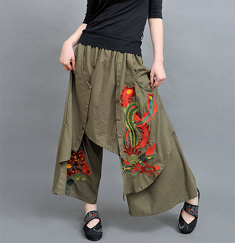 黑色均碼民族風女裝2016春季新款松緊腰闊腿褲顯瘦繡花長褲中國風休閑褲